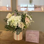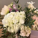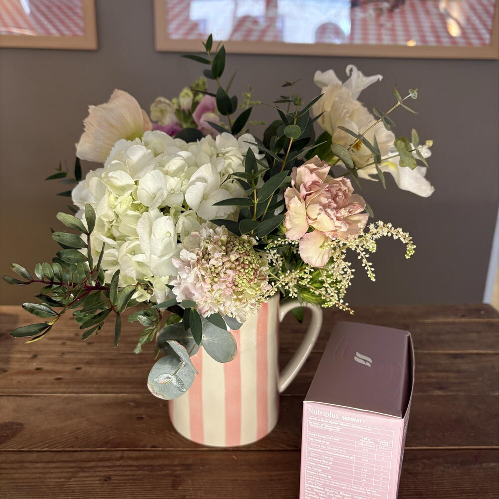 белая гортензия - 1 шт. ветки эвкалипта - 5 шт. белая керамическая кружка с розовыми узорами - 1 шт. коробка чая serenity от farmasi с 30 растворимыми пакетиками со вкусом малины - 1 шт. розовый цветок dragonaria - 1 шт. розовые гвоздики - 2 шт. светлые маки - 2 шт. зелёный помпонный цветок - 1 шт. astillé белый - 2 шт. розовая скабиоза - 1 шт. статис фуксия - 1 шт. вода в чашке - 1 шт. упаковочный пакет - 1 шт.