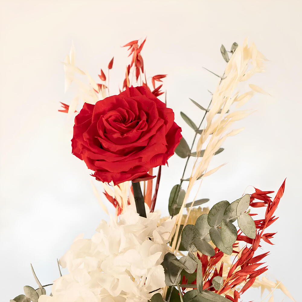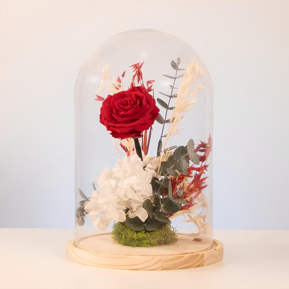 eucalipto estabilizado - 3 шт. cúpula de cristal con base de madera - 1 шт. стабилизированная красная роза - 1 шт. стабилизированная белая гортензия - 1 шт. сухой декоративный овёс - 3 шт. стабилизированный мох - 20 гр.
