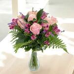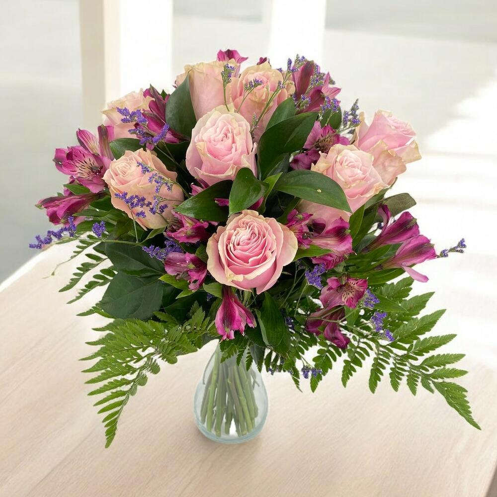 Этот нежный букет сочетает элегантность розовых роз с свежестью фуксиевых альстромерий и ароматной ноткой лимониума в лиловых тонах. Ветки папоротника и зелёные листья придают полевой, природный характер, создавая сбалансированную и естественную композицию. Идеально подходит для украшения дома, чтобы удивить кого-то особенного или в качестве подарка на любой случай.