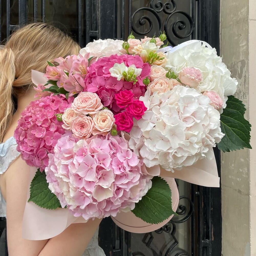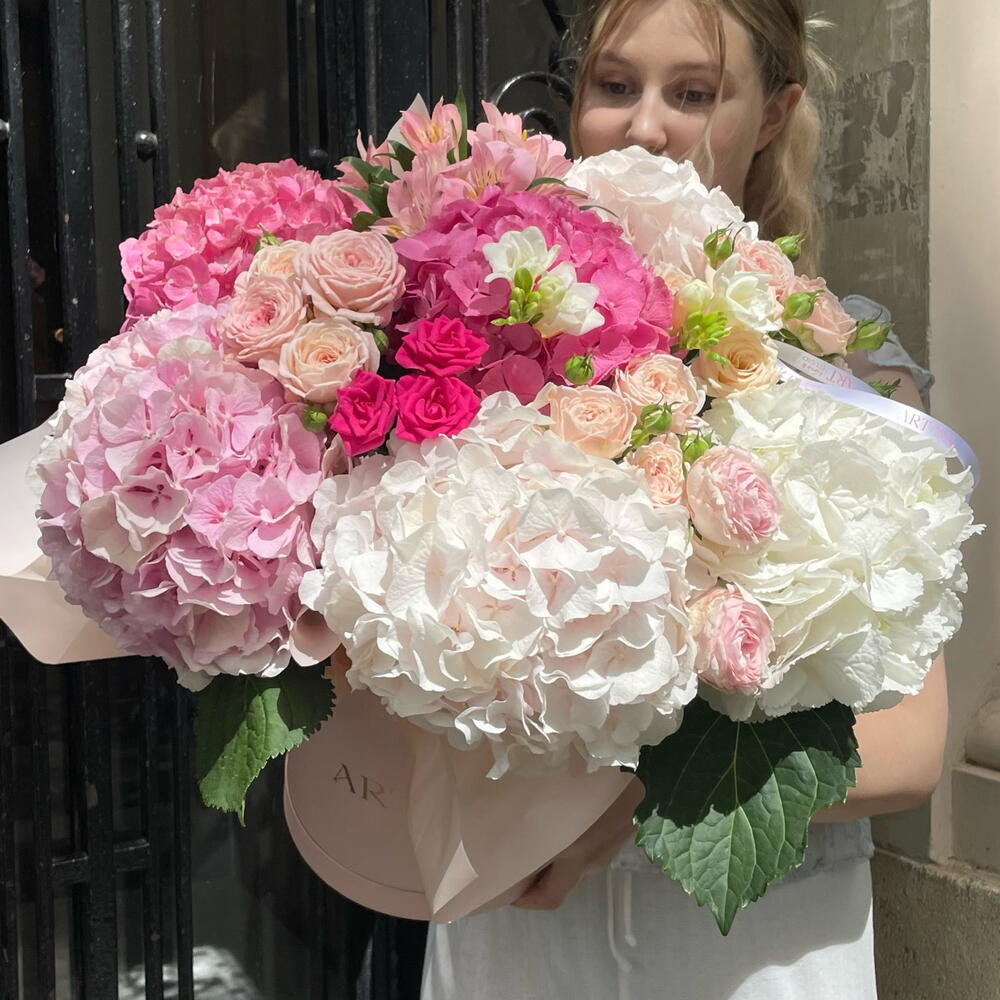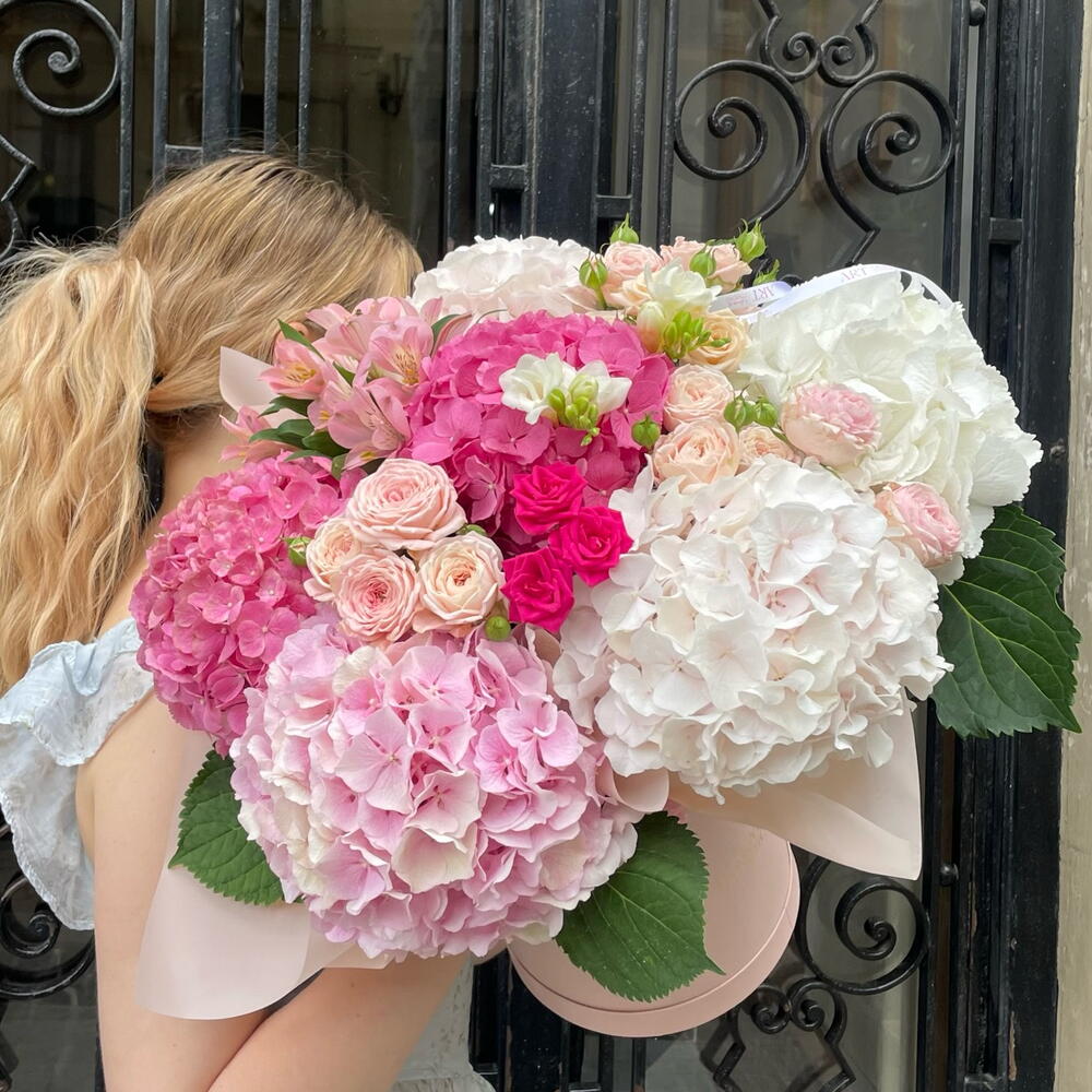 hortensia - 6 шт. freesia white - 2 шт. alstroemerias - 2 шт. bush rose - 6 шт.