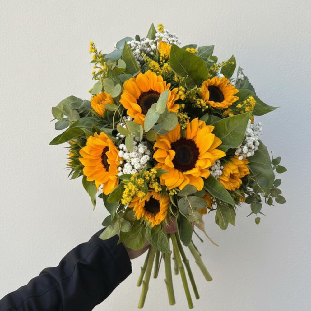 Этот прекрасный цветочный букет из категории De autor перенесёт вас в пышные полевые сады. Состоящий из 7 ярких подсолнухов, вызывающих тепло солнца, этот букет также включает 4 веточки деликатной белой паникулаты, которые придают тонкую и мягкую прелесть. Привлекательность этого букета усиливается 4 стеблями жёлтого солидаго, которые излучают золотистое сияние и придают нотку элегантности. Дополненный 4 ветками эвкалипта, этот букет предлагает освежающую сладковато-мятную ноту, которая завершает чувственное восприятие. Идеально подходит для любого случая, этот цветочный букет — свидетельство красоты и грации природы.