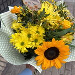 margaritas - 2 шт. claveles - 4 шт. rosas amarillas - 4 шт. подсолнухи - 3 шт. разная зелень - 4 шт. бумага и ленты - 2 шт.