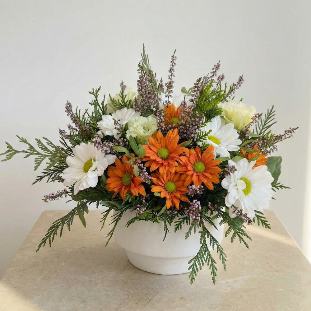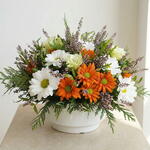 Яркий центральный элемент композиции с оранжевыми и белыми ромашками, эрикой и сезонной зеленью. Его жизнерадостный и гармоничный дизайн пробуждает тепло общих воспоминаний.