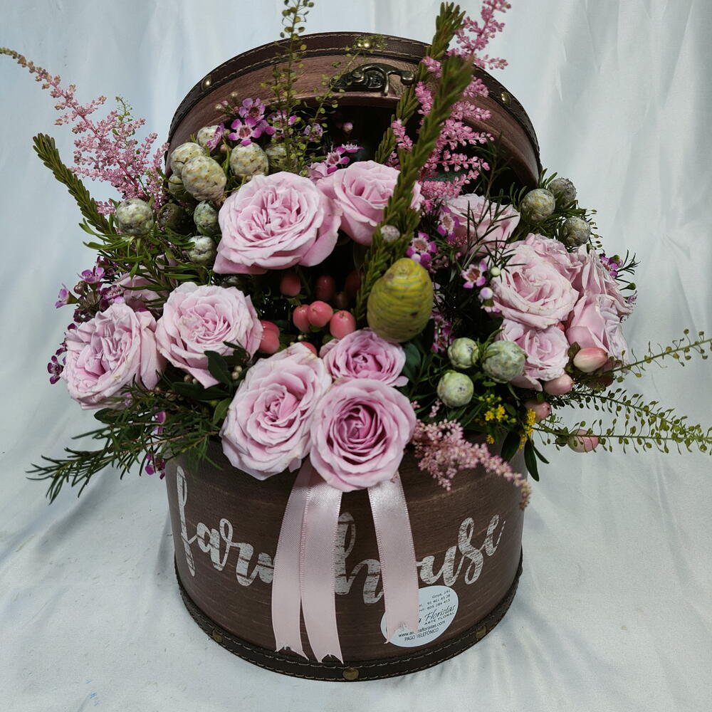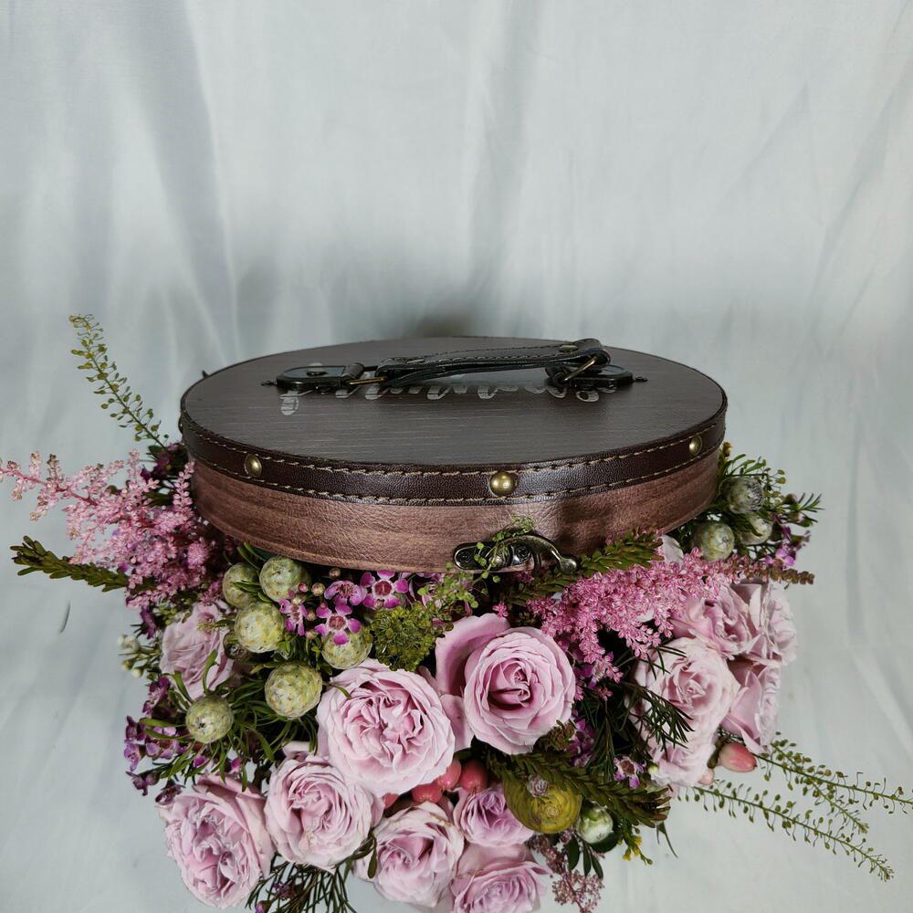astilbe - 3 шт. кустовые розы - 7 шт. восковой цветок - 3 шт. флористическая губка - 3 шт. африканская зелень - 6 шт. шляпная коробка - 1 шт.