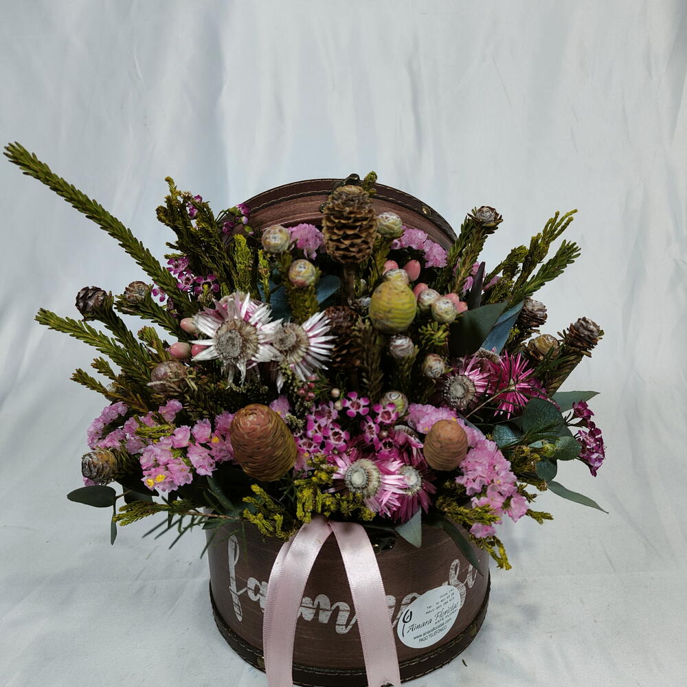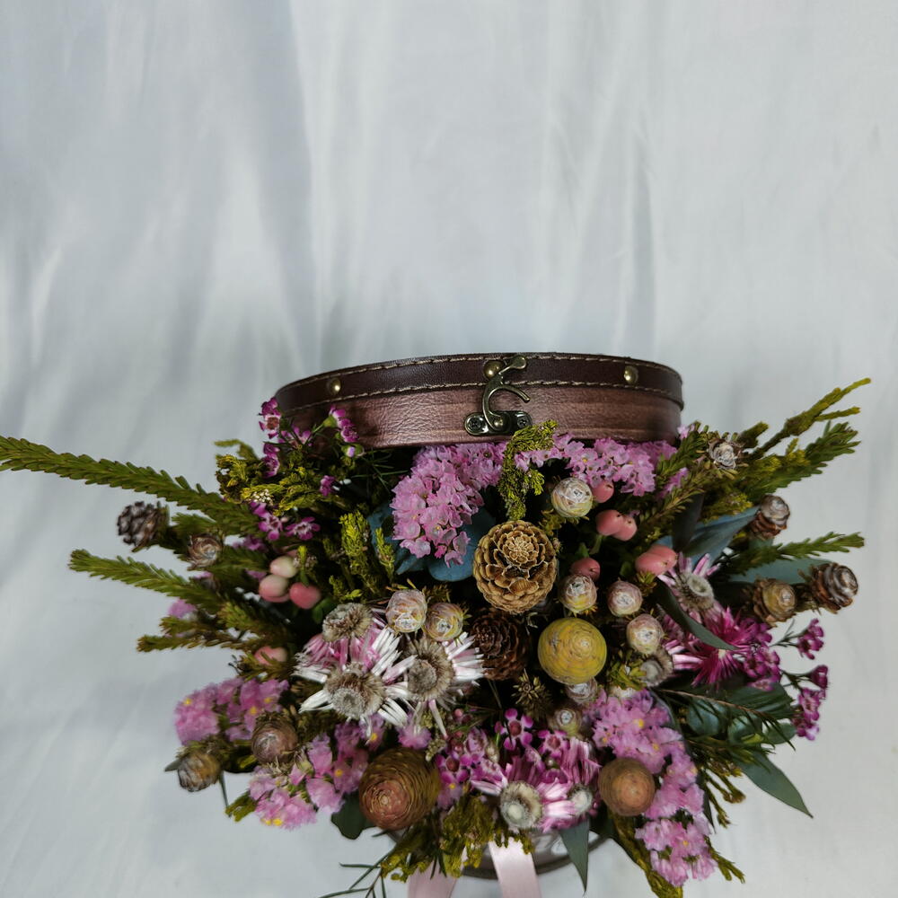 Statice - 5 шт. эвкалипт цинерея - 3 шт. флористическая губка - 3 шт. африканская зелень - 10 шт. шляпная коробка - 1 шт.