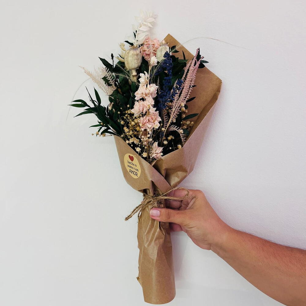 Эта прекрасная коллекция стабилизированных цветов сочетает в себе красоту сельской местности и деревенское очарование. Она состоит из двух высушенных маковых коробочек, трёх стеблей сушёной лаванды с её неповторимым ароматом и трёх веточек нежно-розовых цветов, дополненных двумя веточками ярко-жёлтого высушенного солидаго. Композиция дополнена двумя веточками стабилизированного папоротника белого и розового цветов и двумя веточками натурального фаляриса. Прекрасный подарок на любой случай или идеальное украшение для вашего дома.