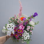 Limonium - 4 шт. Gerbera - 1 шт. craspedia - 3 шт. eucalipto - 5 шт. clavel - 2 шт. фиолетовая маргаритка - 6 шт. гипсофила - 3 шт. фиолетовый колокольчик - 1 шт. белая далия с чёрным центром - 2 шт.