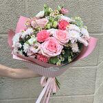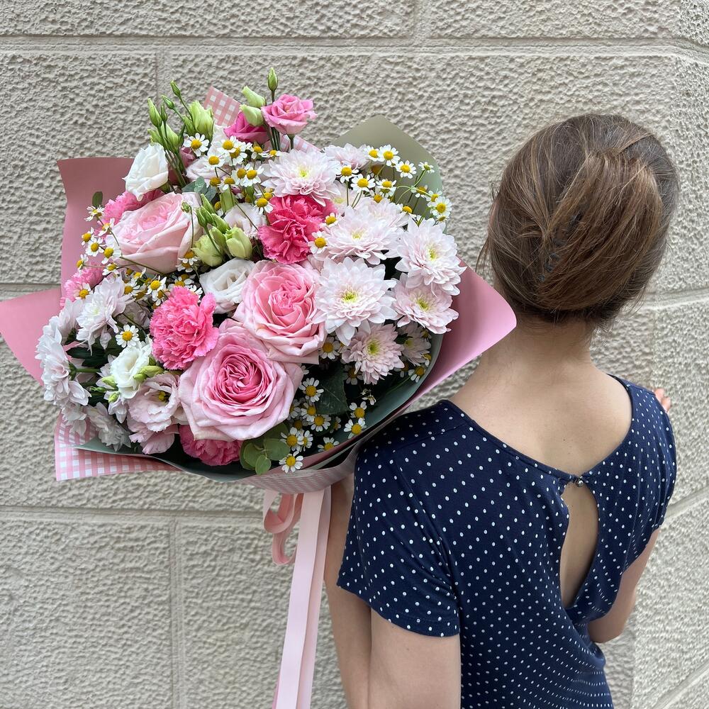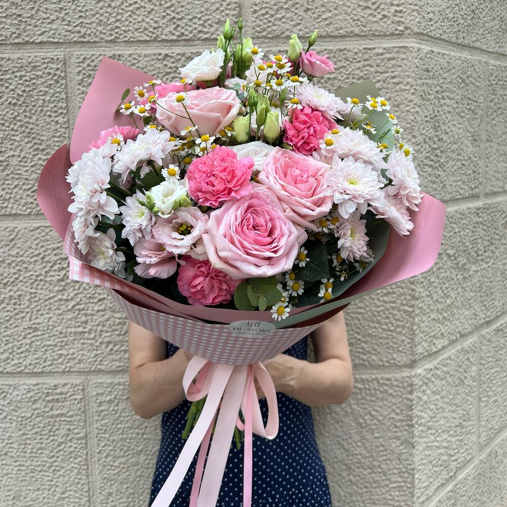 Lisianthus - 4 шт. eucalipto - 3 шт. rosas - 3 шт. margaritas - 5 шт. clavel - 5 шт. crisantemos - 3 шт.