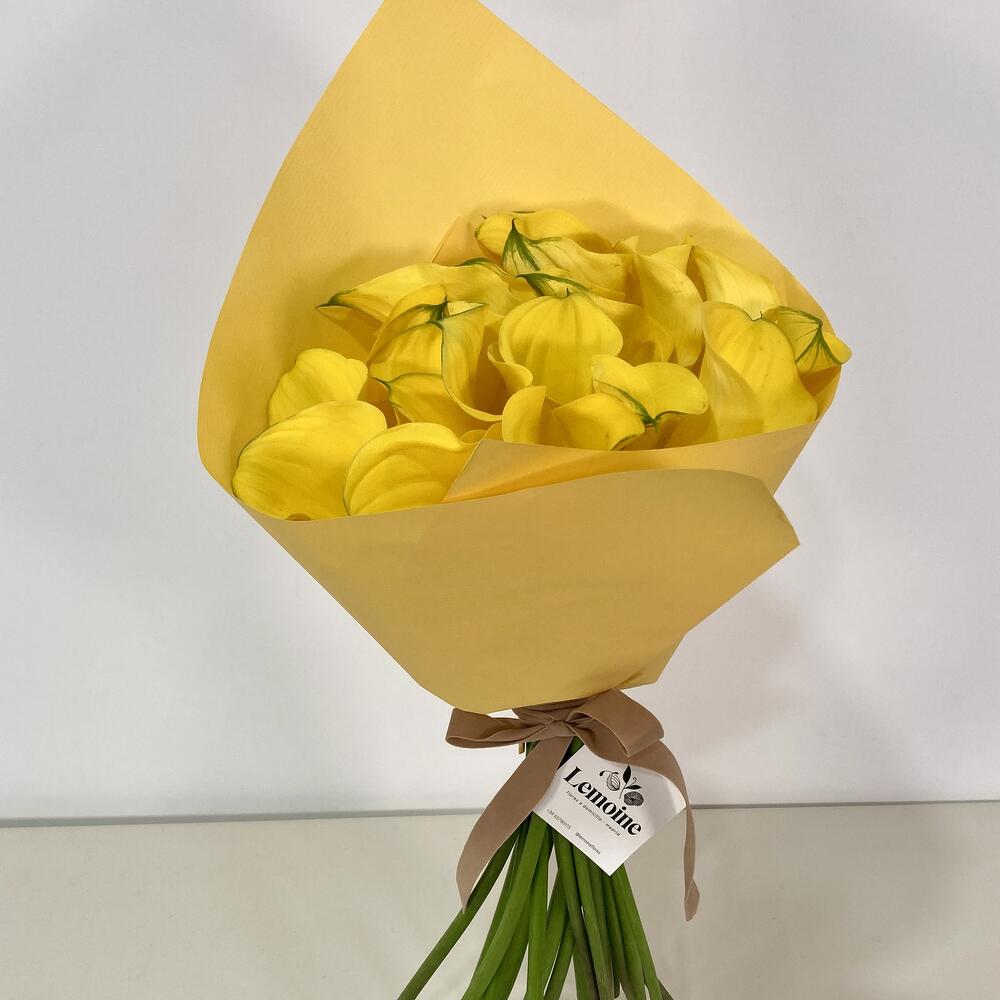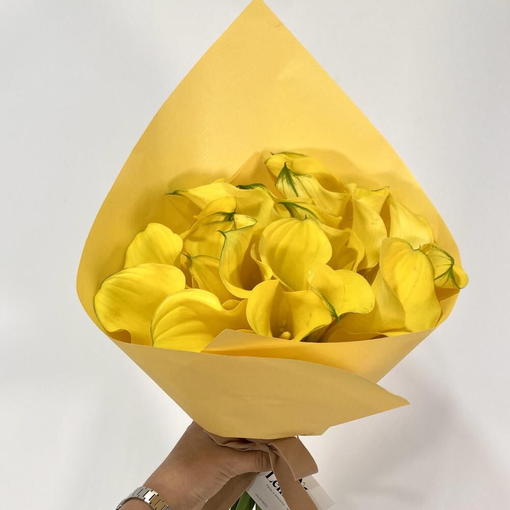 Монобукет из калл жёлтого первичного цвета. Впечатляющие капли солнца, чтобы озарить жизнь.
