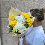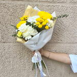 Este encantador ramo irradia calidez y alegría con su vibrante combinación de tonos amarillos y blancos. Las majestuosas rosas blancas y crisantemos amarillos brillantes se entrelazan con delicados detalles de pompones amarillos y follaje de eucalipto, creando una composición equilibrada y luminosa. Envuelto en un elegante papel blanco con un toque dorado y un lazo decorativo, este ramo es perfecto para transmitir felicidad y energía positiva. Ideal para celebraciones, agradecimientos o simplemente para iluminar el día de alguien especial.