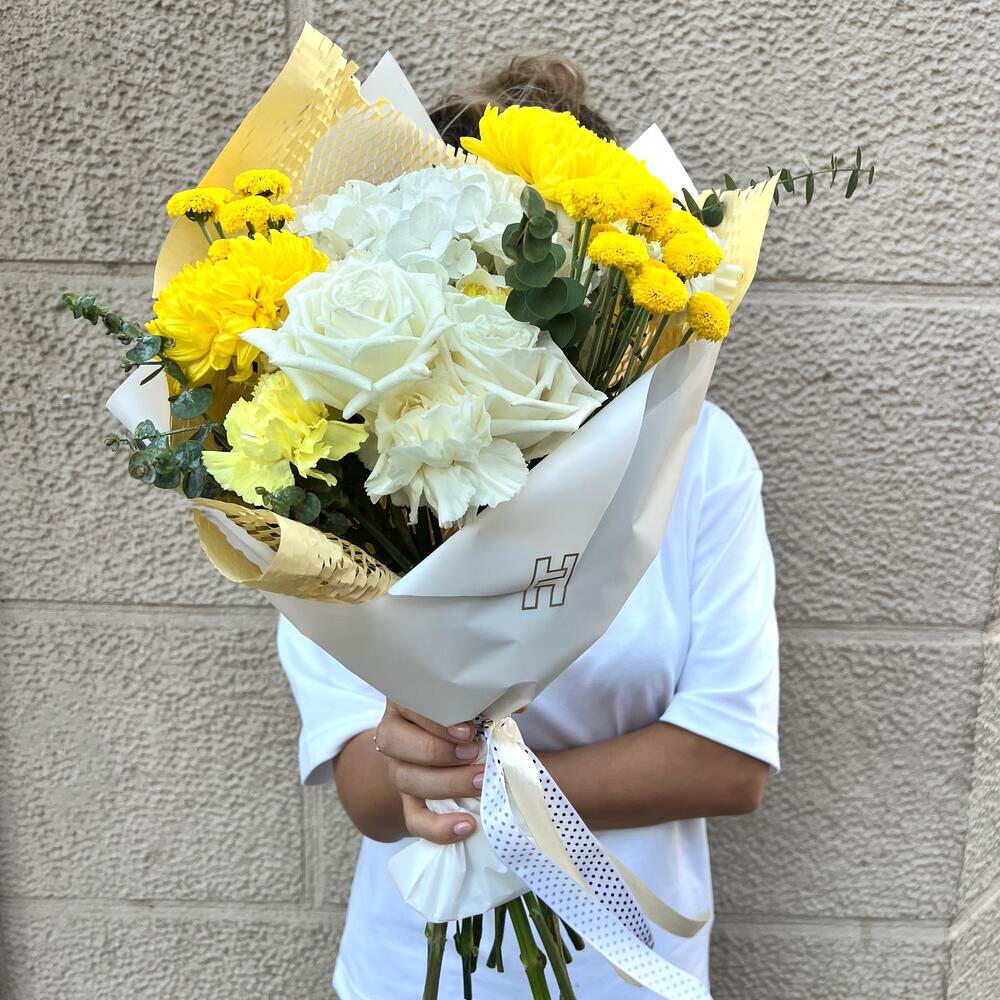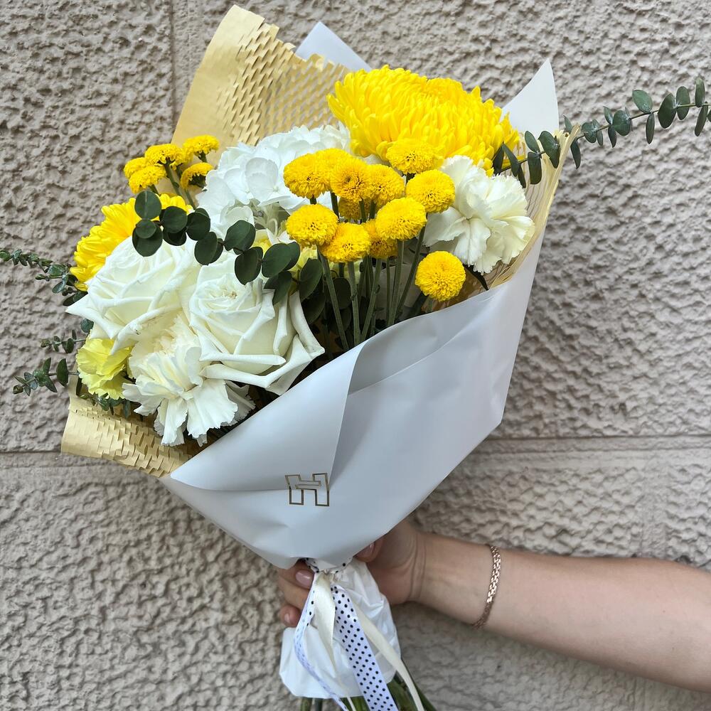 Este encantador ramo irradia calidez y alegría con su vibrante combinación de tonos amarillos y blancos. Las majestuosas rosas blancas y crisantemos amarillos brillantes se entrelazan con delicados detalles de pompones amarillos y follaje de eucalipto, creando una composición equilibrada y luminosa. Envuelto en un elegante papel blanco con un toque dorado y un lazo decorativo, este ramo es perfecto para transmitir felicidad y energía positiva. Ideal para celebraciones, agradecimientos o simplemente para iluminar el día de alguien especial.