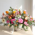 Цветочная корзина SUSAN — это яркая, наполненная цветом композиция, вдохновлённая свежестью весны. Эта композиция выделяется своей смесью цветов в розовых, оранжевых, жёлтых и кремовых тонах, создавая непринуждённый, молодёжный и очень светлый дизайн. Розовые розы, центральные элементы композиции, придают элегантность и романтичность, а герберы и ранункулы добавляют живость и цвет. Ромашки и полевые цветы придают естественность и свежесть, тогда как гвоздики и сезонные цветы дополняют композицию фактурой и объёмом. Эвкалипт и декоративная зелень придают движение и мягкий аромат, который уравновешивает композицию.