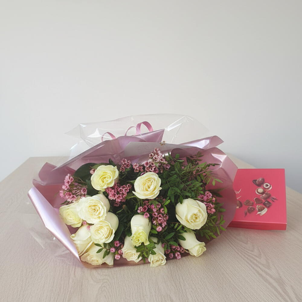 Этот нежный букет сочетает элегантность белых роз с нежностью маленьких розовых цветов, создавая идеальную и очаровательную гармонию. Его цвета передают чистоту, нежность и спокойствие, идеально подходящие для выражения искренних и глубоких чувств. Упаковка в мягких тонах подчёркивает красоту композиции, придавая ей романтичный и утончённый вид. Кроме того, в комплект входит коробка шоколадных конфет, что делает этот подарок полноценным и запоминающимся. Идеально подходит для годовщин, дней рождения или просто чтобы удивить жестом, полным любви. Каждый элемент был тщательно подобран, чтобы передать истинные эмоции.