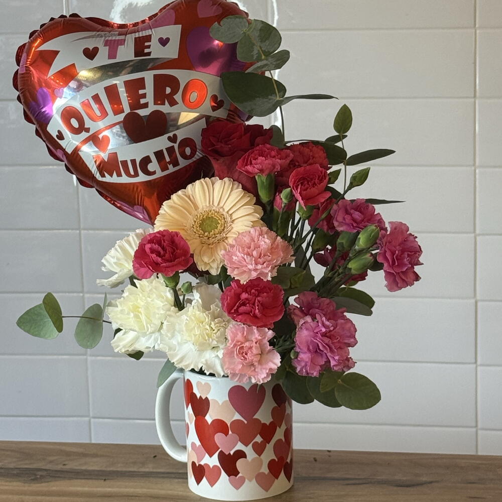 Gerbera - 2 шт. rosas - 2 шт. claveles - 4 шт. разная зелень - 2 шт. гвоздики - 4 шт. шар-сердце - 1 шт. кружка с сердечками - 1 шт.