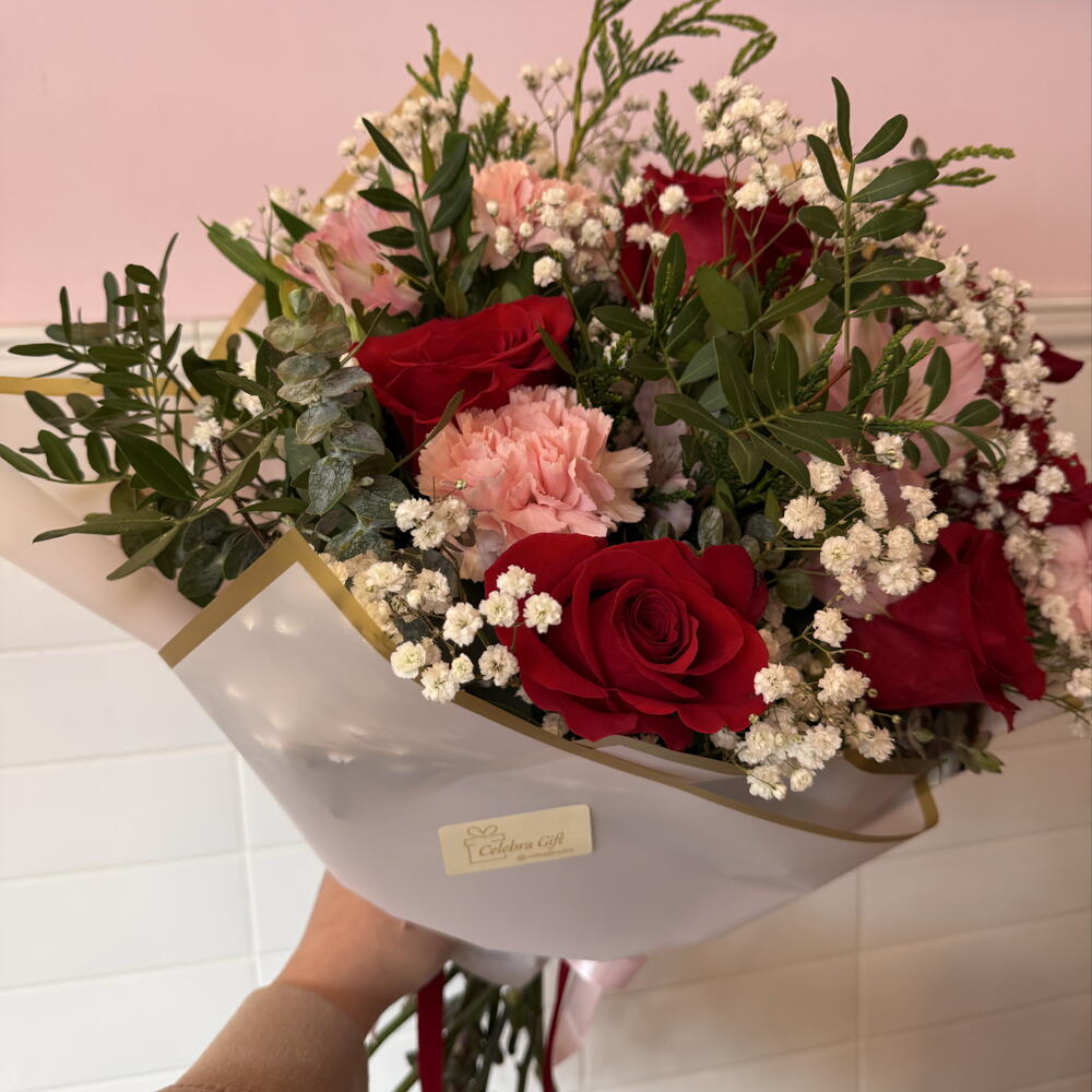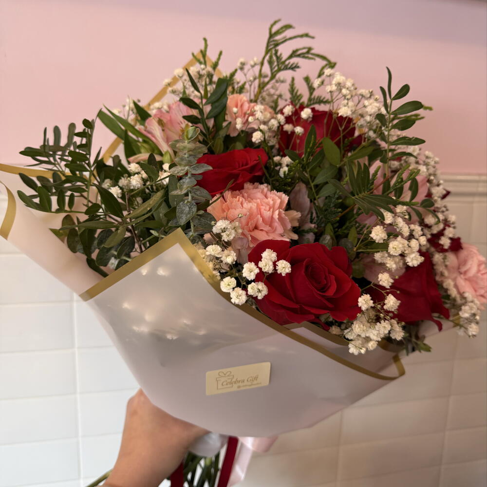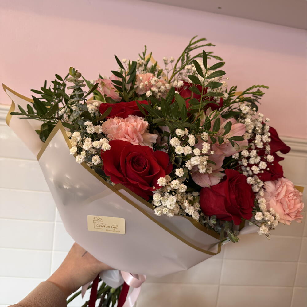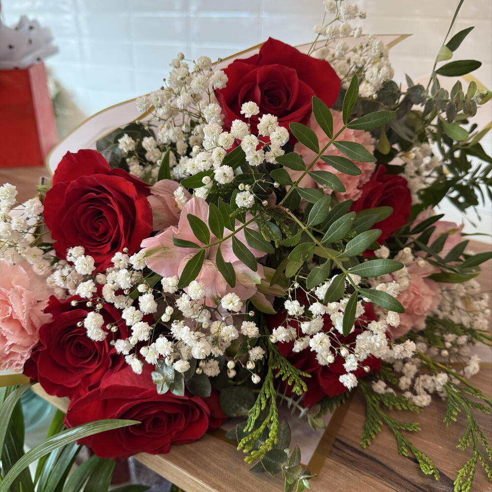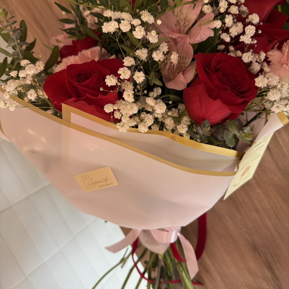 eucalipto - 3 шт. paniculata - 3 шт. claveles - 3 шт. rosas rojas - 6 шт. разная зелень - 3 шт. декоративная бумага и ленты - 2 шт. альстромерии - 2 шт.