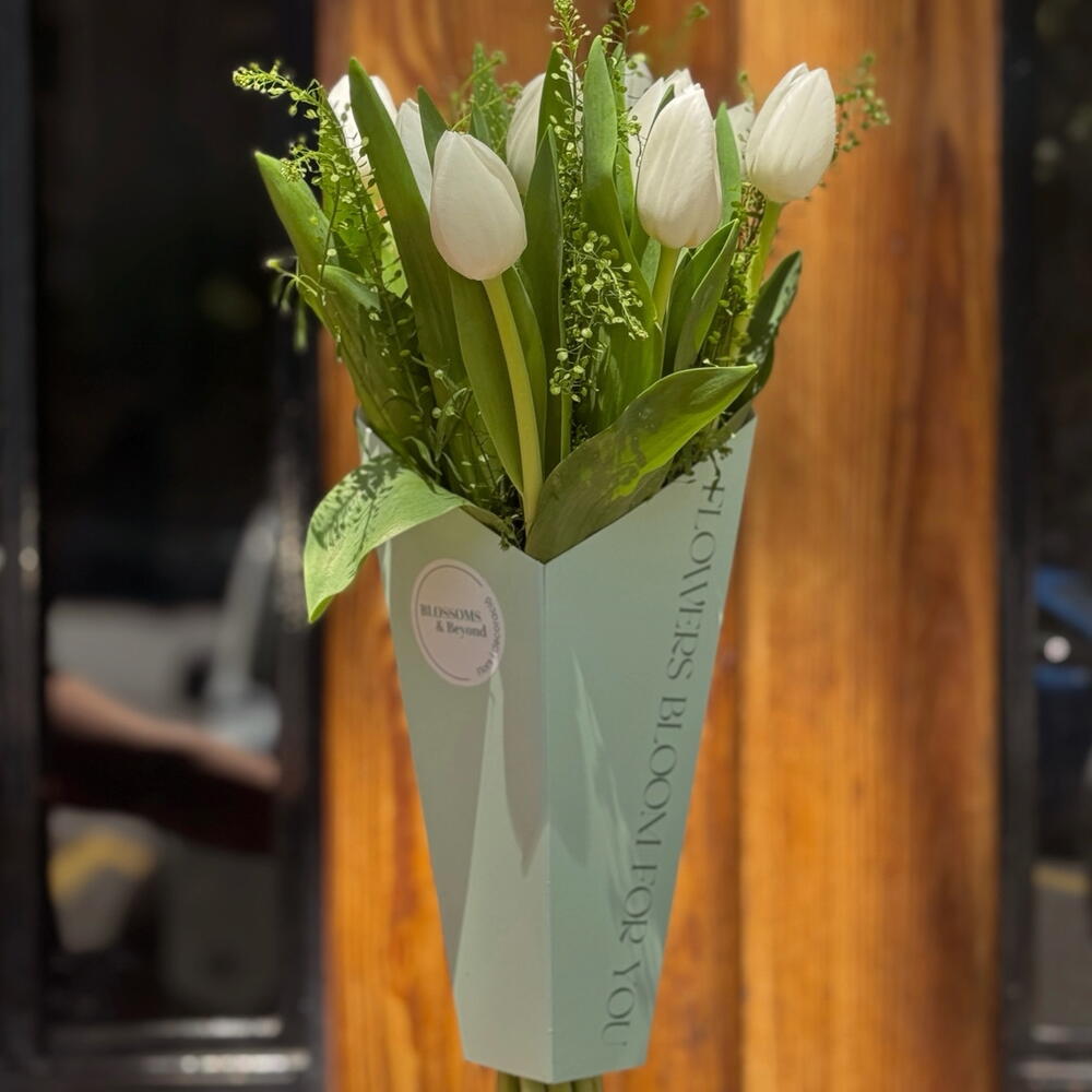 белые тюльпаны - 10 шт. декоративная листва - 3 шт. подарочная упаковка - 1 шт.