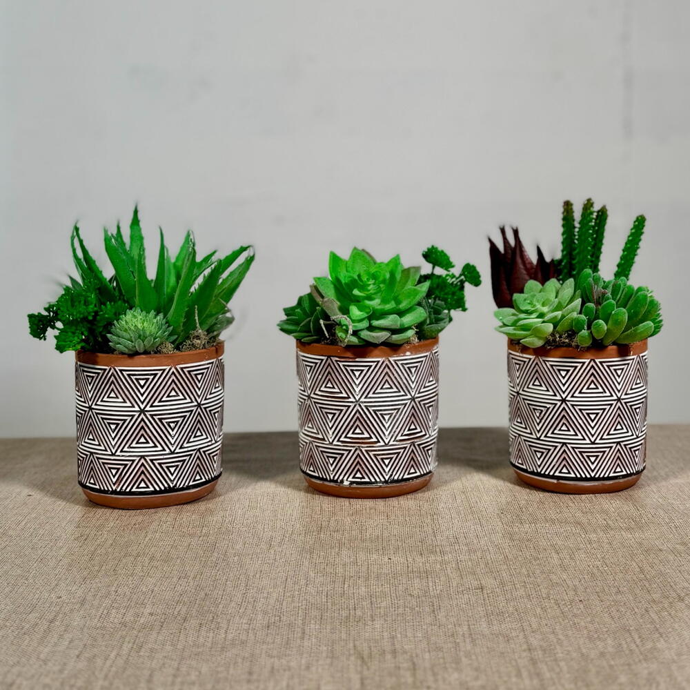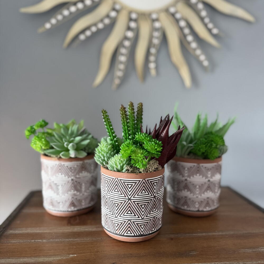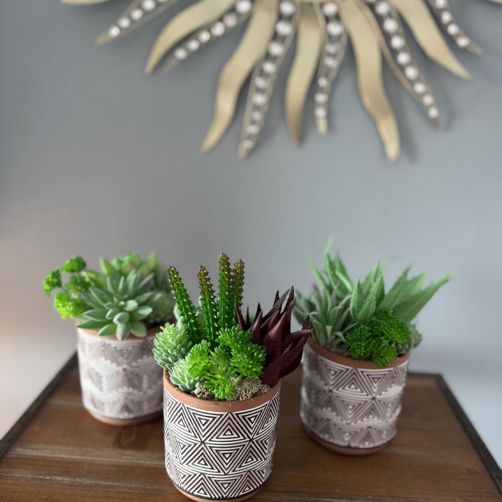 Представляем Tres Amigos — очаровательное трио искусственных суккулентов, которые привнесут частичку природной красоты в любое пространство, не требуя полива и солнечного света. Каждый маленький садик оформлен в уникальном стиле с реалистичными суккулентами в горшках с геометрическим узором, что делает их идеальными для размещения на столах, полках или в качестве подарка. Вместе они символизируют дружбу, баланс и гармонию — три разные личности, которые дополняют друг друга, как настоящие друзья. Неприхотливые в уходе — всегда свежие, не требуют особого внимания. Стильный дизайн — нейтральные горшки с современными узорами подойдут к любому интерьеру. Значимый подарок — трио, символизирующее единство и связь. Идеально подходит для украшения вашего дома, офиса или для того, чтобы поделиться ими со своими «тремя друзьями».