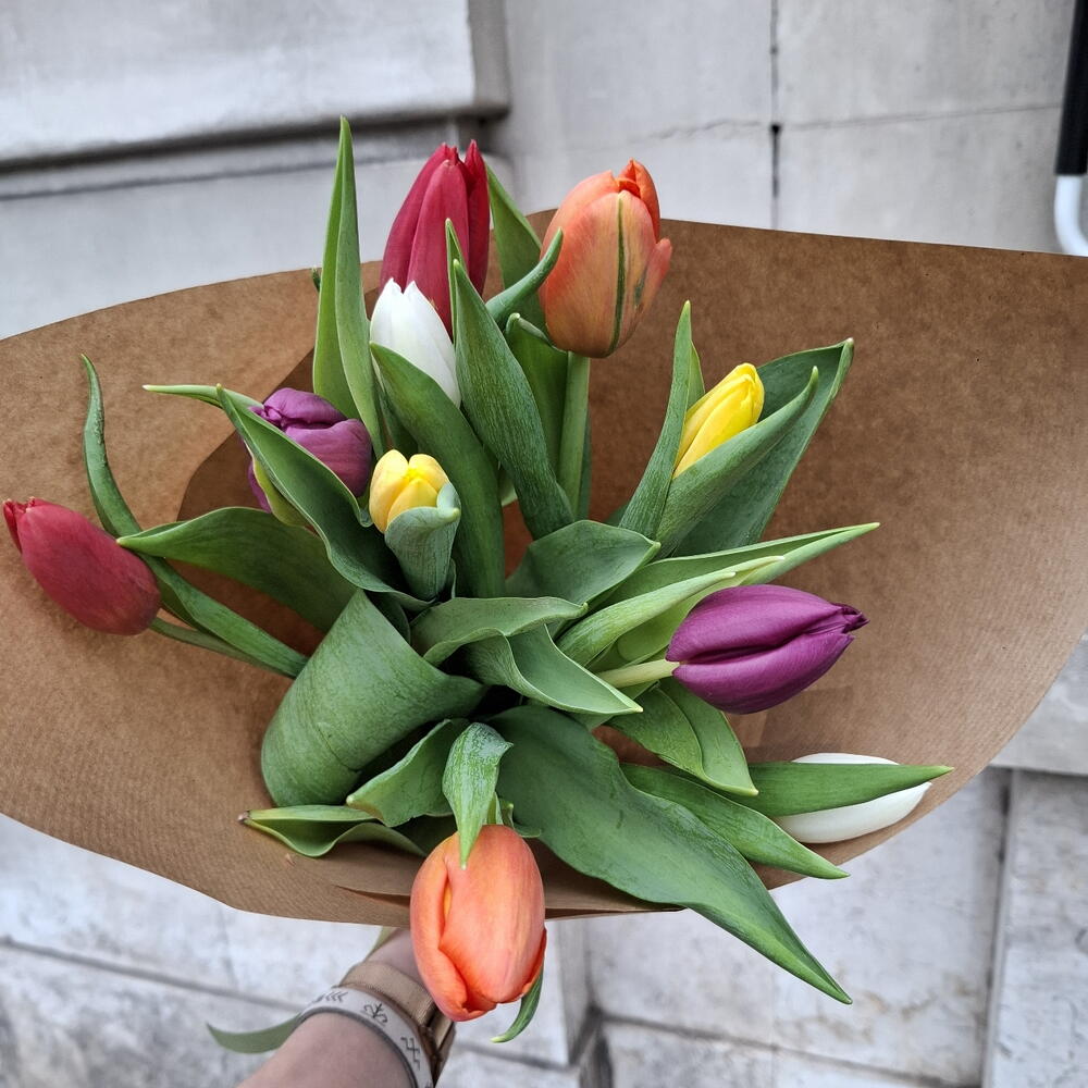 cinta de raso - 1 шт. разноцветные тюльпаны - 10 шт. декоративная бумага - 1 шт.
