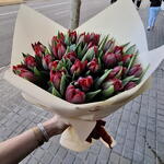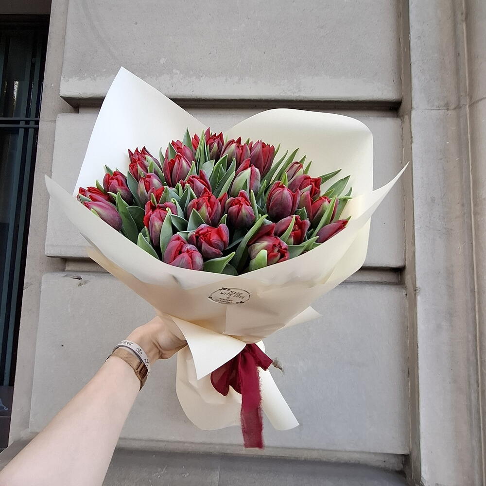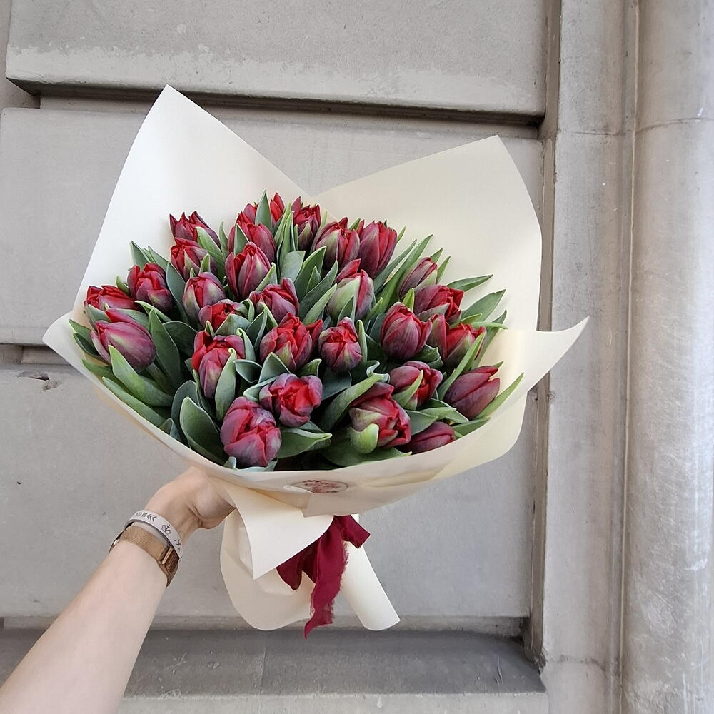 cinta de raso - 1 шт. papel decorativo kraft - 2 шт. красный тюльпан - 25 шт.