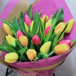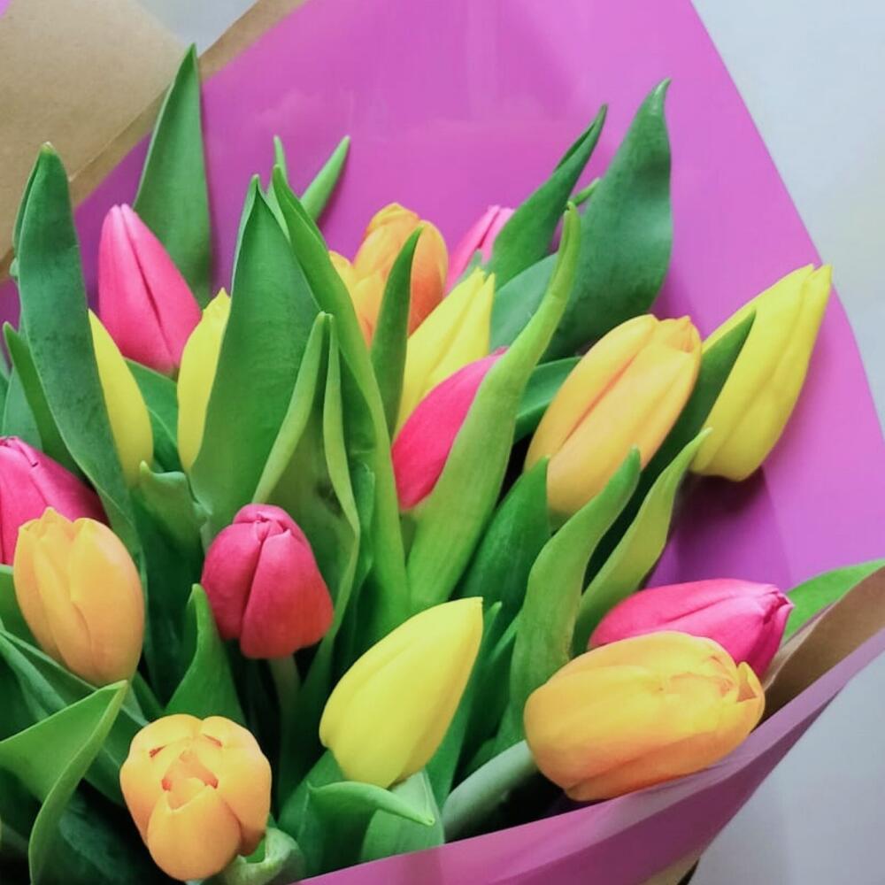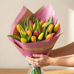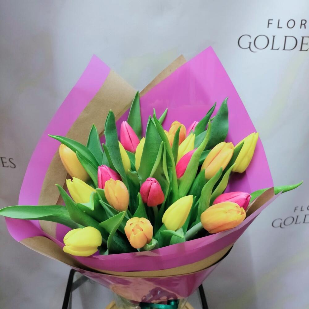 С эффектным сочетанием жёлтых, розовых и оранжевых тюльпанов этот прекрасный классический букет — настоящий шедевр. Состоящий из 20 тюльпанов, этот букет привнесёт яркий цветовой акцент в любую комнату. Идеально гармонируя, эклектичные оттенки этих тюльпанов наверняка скрасят ваш день и вызовут восхищение у всех. Отмечаете ли вы день рождения, годовщину или просто хотите впечатлить того самого особенного человека, этот классический букет — верный выбор.