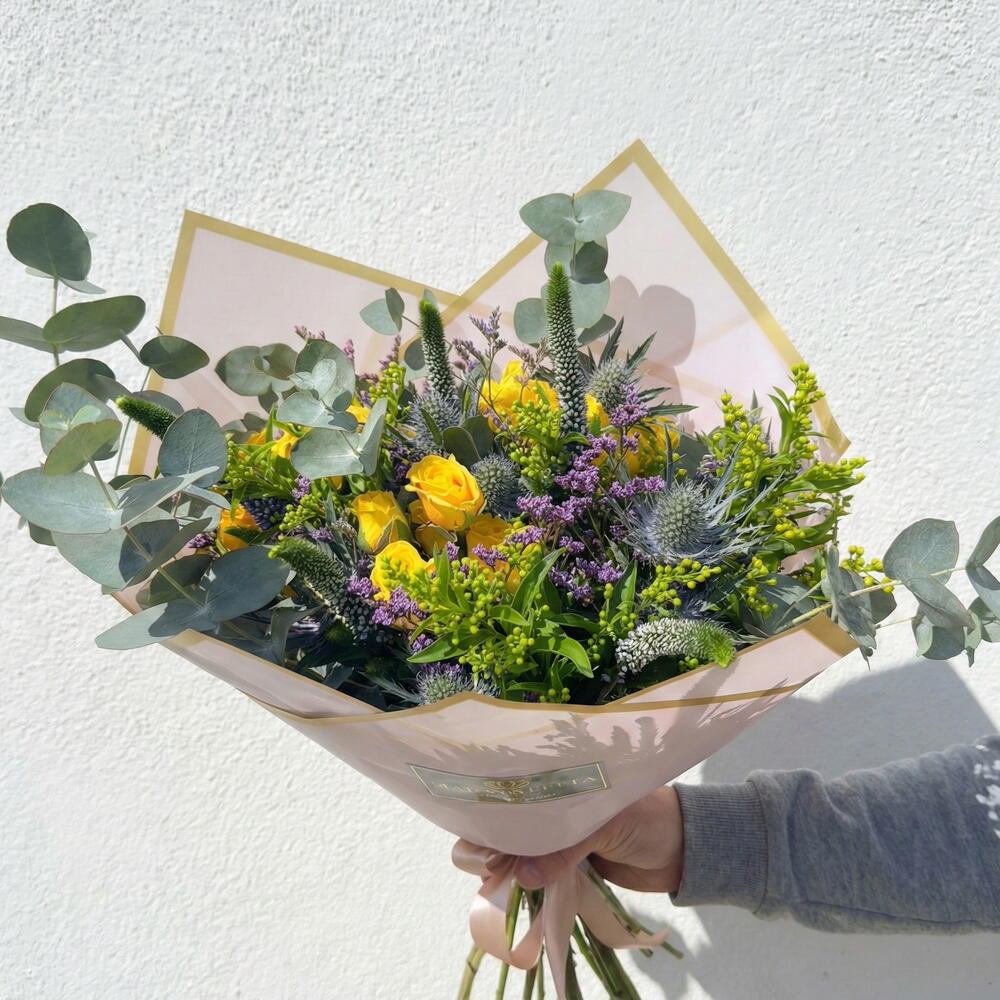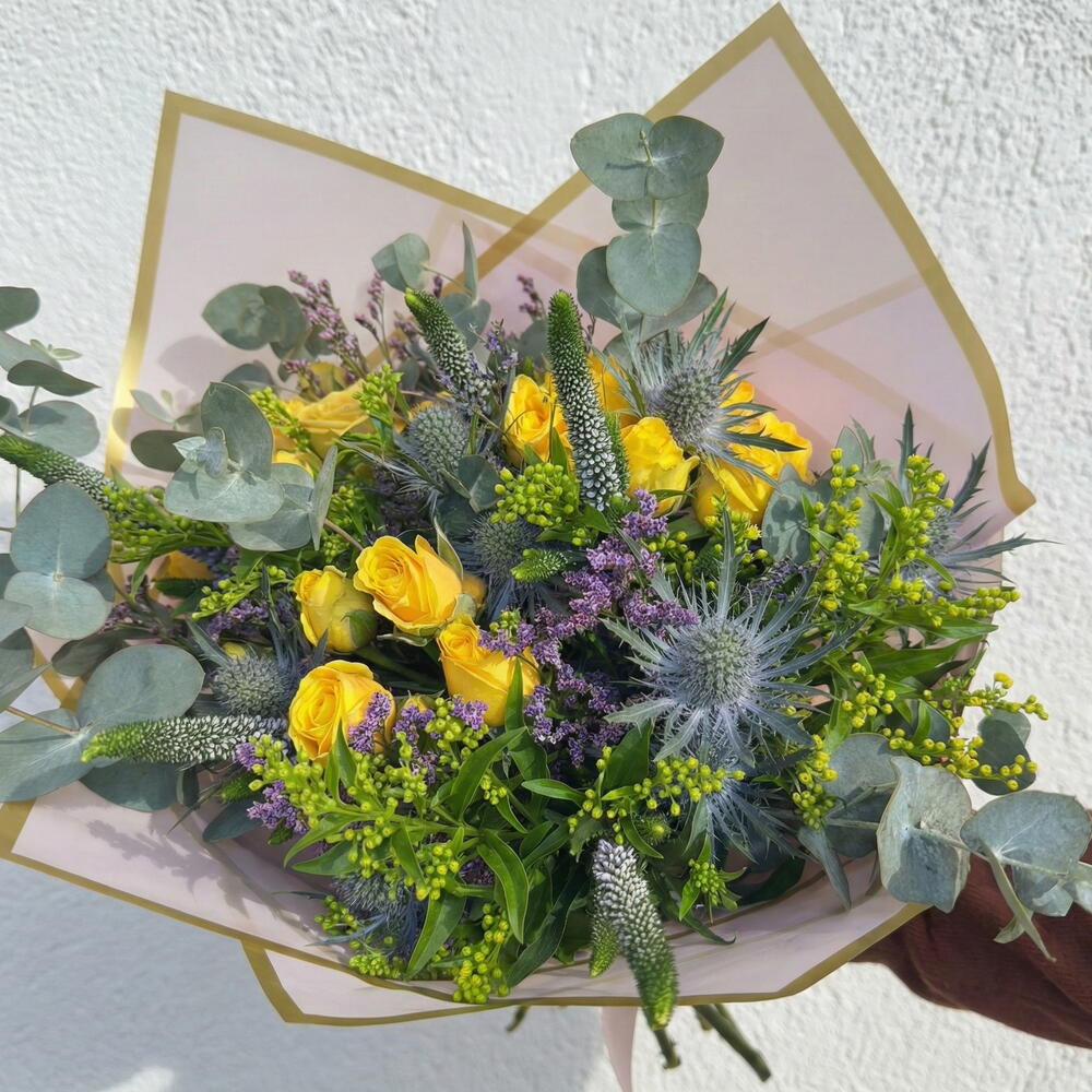 Свежий и светлый букет, состоящий из жёлтых роз, в сопровождении голубого эрингиума, вероники, статицы и деликатных штрихов натуральной зелени, таких как эвкалипт и разнообразная листва. Сочетание жёлтых, зелёных и синих тонов создаёт композицию, полную энергии, свежести и индивидуальности, идеальную для передачи радости, благодарности и добрых пожеланий.