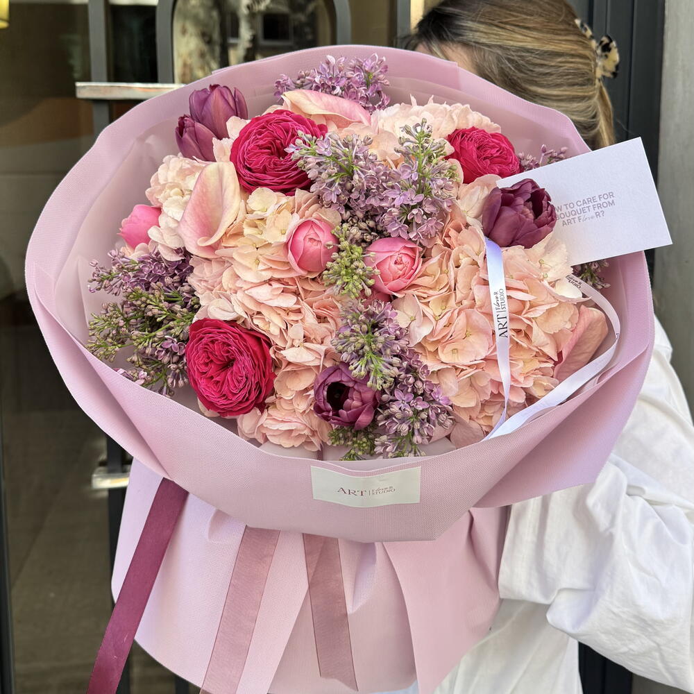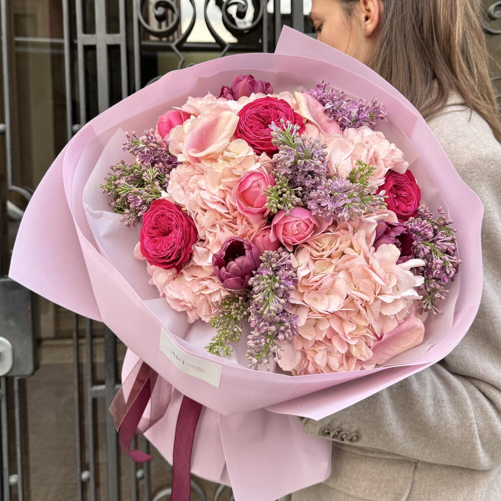 Гортензия - 5 шт. Калла - 2 шт. Сирень - 4 шт. тюльпаны - 4 шт. пионовидные розы - 3 шт. кустовые розы - 2 шт.