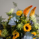 eucalipto - 6 шт. разнообразная зелень - 8 шт. подсолнухи - 7 шт. eryngium azul - 5 шт. жёлтая ахиллея - 5 шт. kniphofia оранжевая (стебли) - 3 шт.