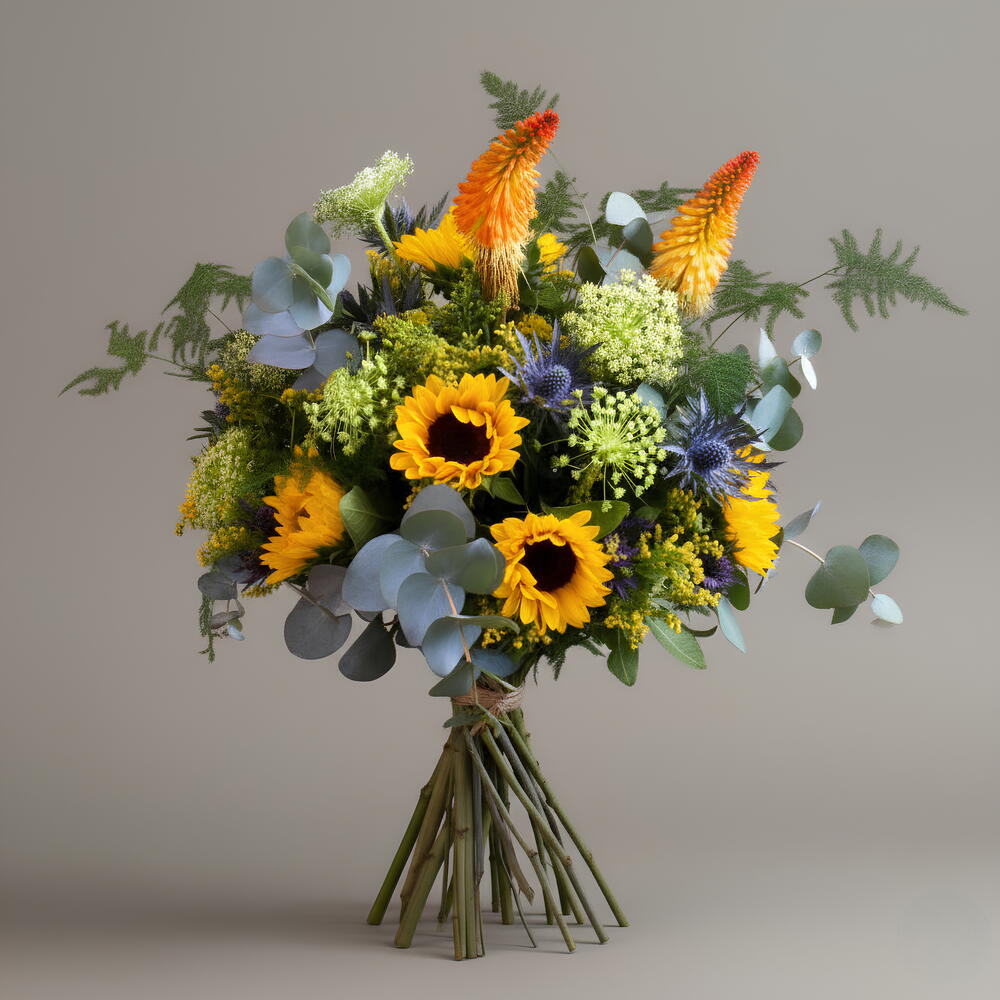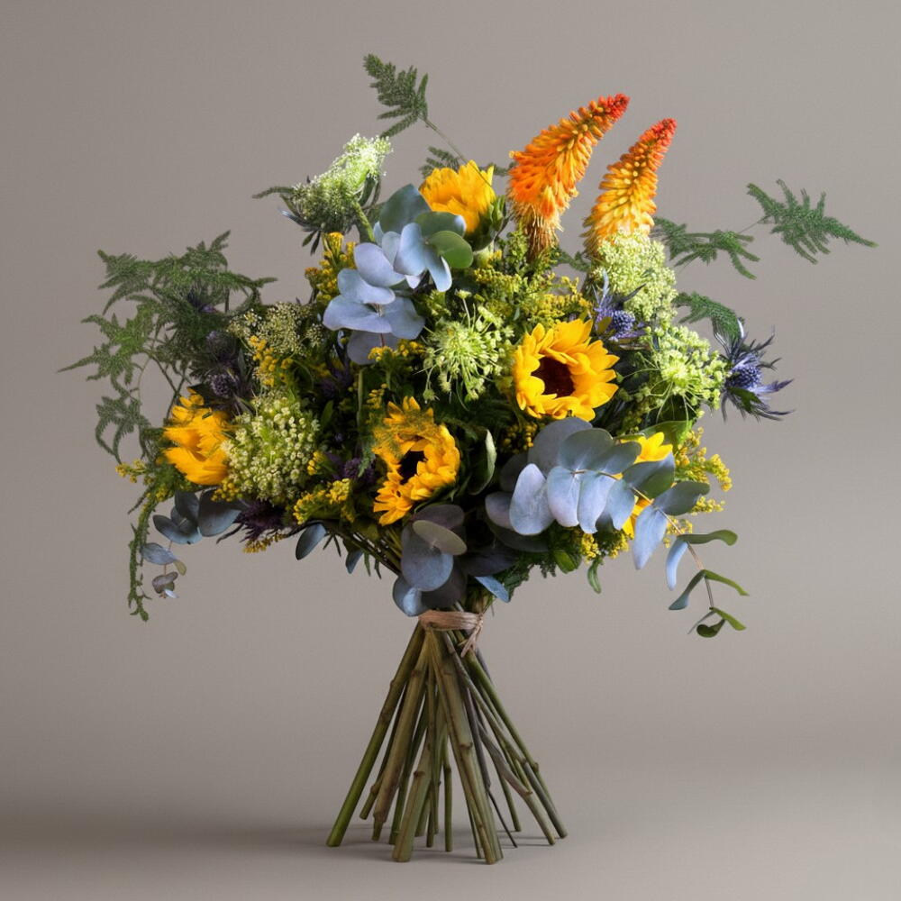 eucalipto - 6 шт. разнообразная зелень - 8 шт. подсолнухи - 7 шт. eryngium azul - 5 шт. жёлтая ахиллея - 5 шт. kniphofia оранжевая (стебли) - 3 шт.
