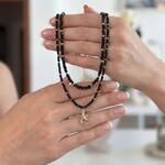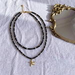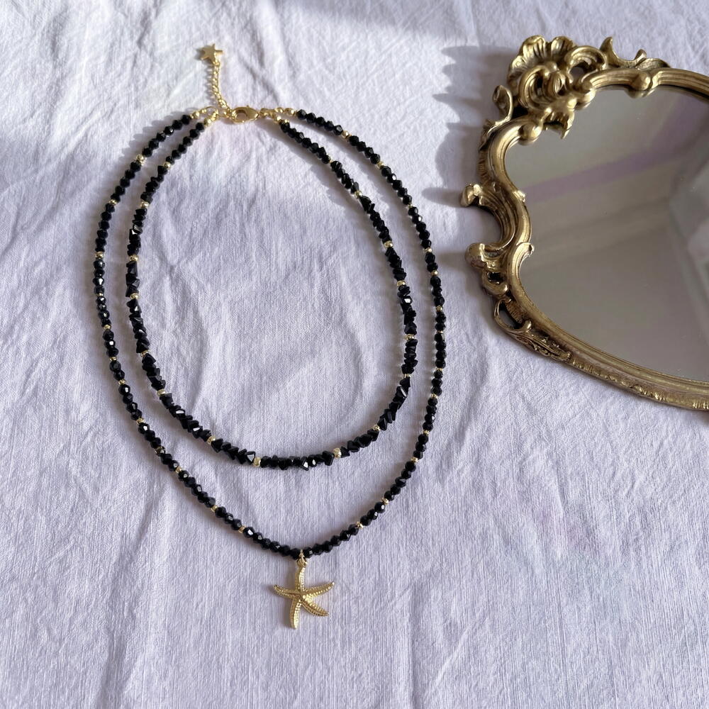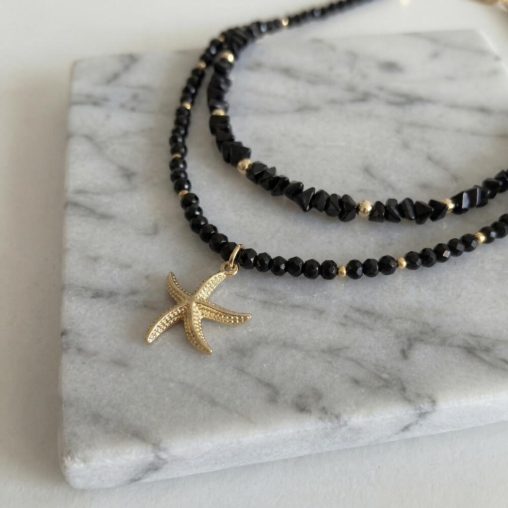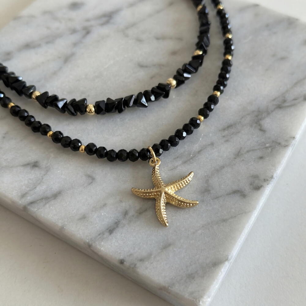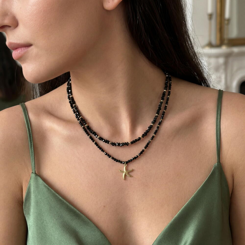 This starfish set is a gentle reminder that summer is just around the corner. And what’s a summer without a marine theme? A thin mini Spinel stones choker in a set with a triangular Czech glass necklace combined with a 14K gold plated starfish pendant. So elegant and so fashionable, just what you need this summer. ✔️ High-quality, hypoallergenic hardware with 18K gold plating ✔️ Jewelry-grade stainless wire ✔️ Spinel beads 3 mm ✔️ Triangular Czech glass 4 mm ✔️ Pendant 15 mm, plated with 14 K gold ✔️ Length: 41 cm + 5 cm extension chain The piece comes in gift packaging and a protective pouch — ready for gifting or safe storage. Author’s design, handcrafted. This means you won’t meet anyone wearing exactly the same piece.