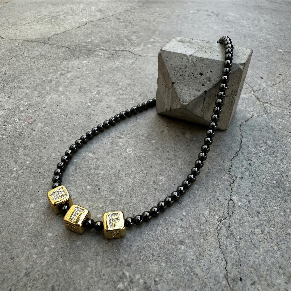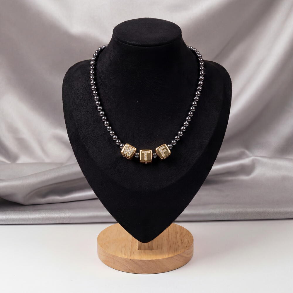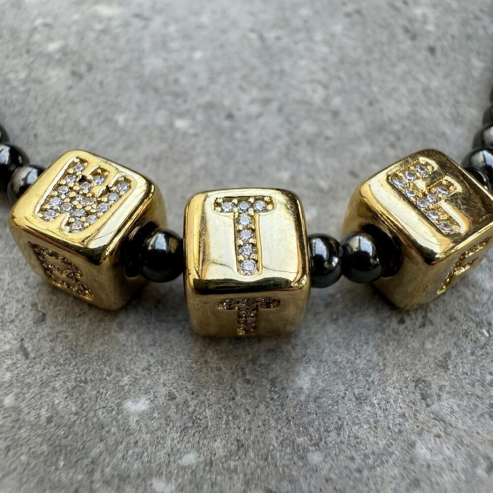 No words needed when your necklace says it all. If you’re not afraid to be the center of attention and are bold, then this necklace is made just for you. Be yourself. ✔️ High-quality, hypoallergenic hardware with rhodium plating ✔️ Jewelry-grade stainless wire ✔️ Hematite beads 4 mm ✔️ Square 9 mm beads, 18K gold-plated, with letters inlaid with cubic zirconia ✔️ Length: 41 cm + 5 cm extension chain The piece comes in gift packaging and a protective pouch — ready for gifting or safe storage. Author’s design, handcrafted. This means you won’t meet anyone wearing exactly the same piece.