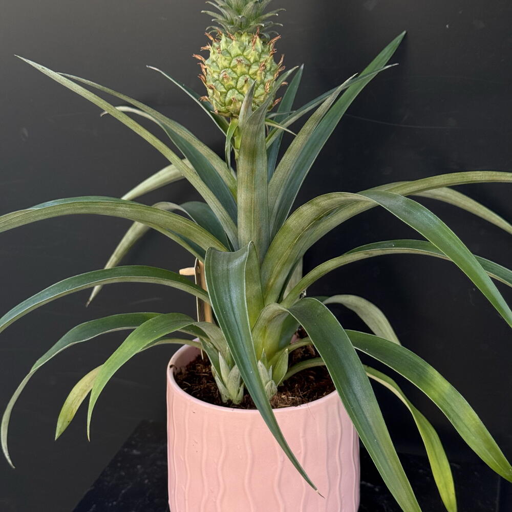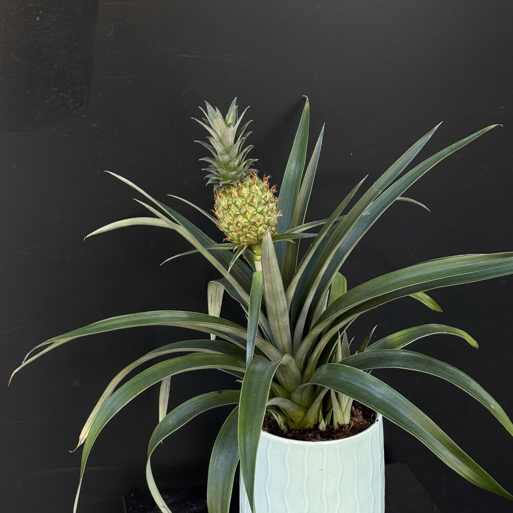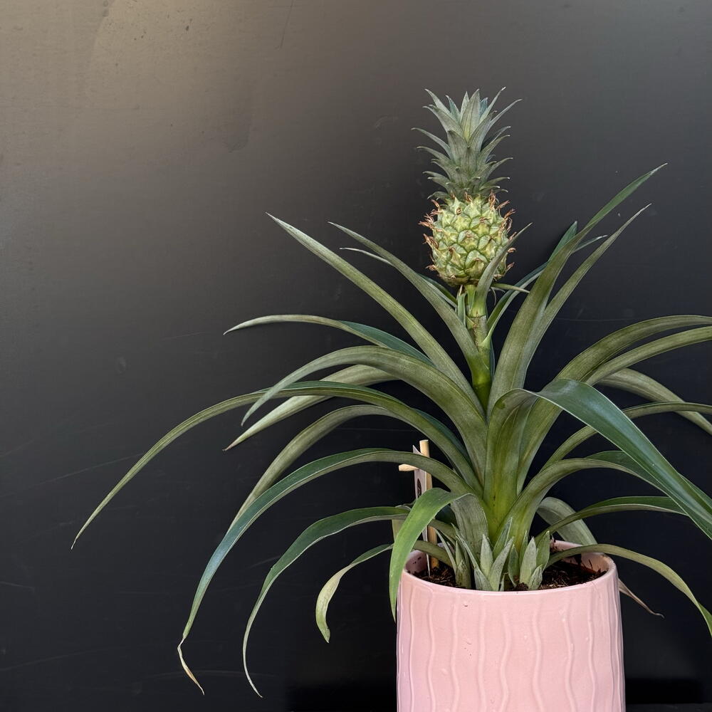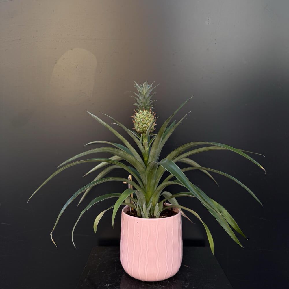 Piña ornamental en maceta: una planta tropical elegante con hojas verdes alargadas y un pequeño fruto decorativo en la parte superior. Perfecta para dar un toque exótico y moderno a cualquier espacio interior. *La maceta disponible en blanco o rosa (color sujeto a la disponibilidad).