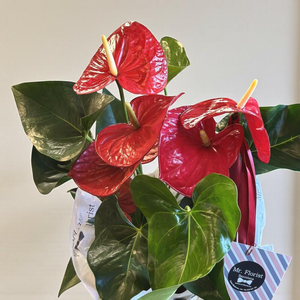 Красный антуриум — элегантное и долговечное растение, идеальное для наполнения любого пространства жизнью и цветом. Его блестящие цветы в форме сердца передают любовь и хорошую энергию, а насыщенно-зелёная листва создаёт впечатляющий контраст. Идеально подходит для светлых помещений, придаёт домам и офисам тропический и утончённый акцент.