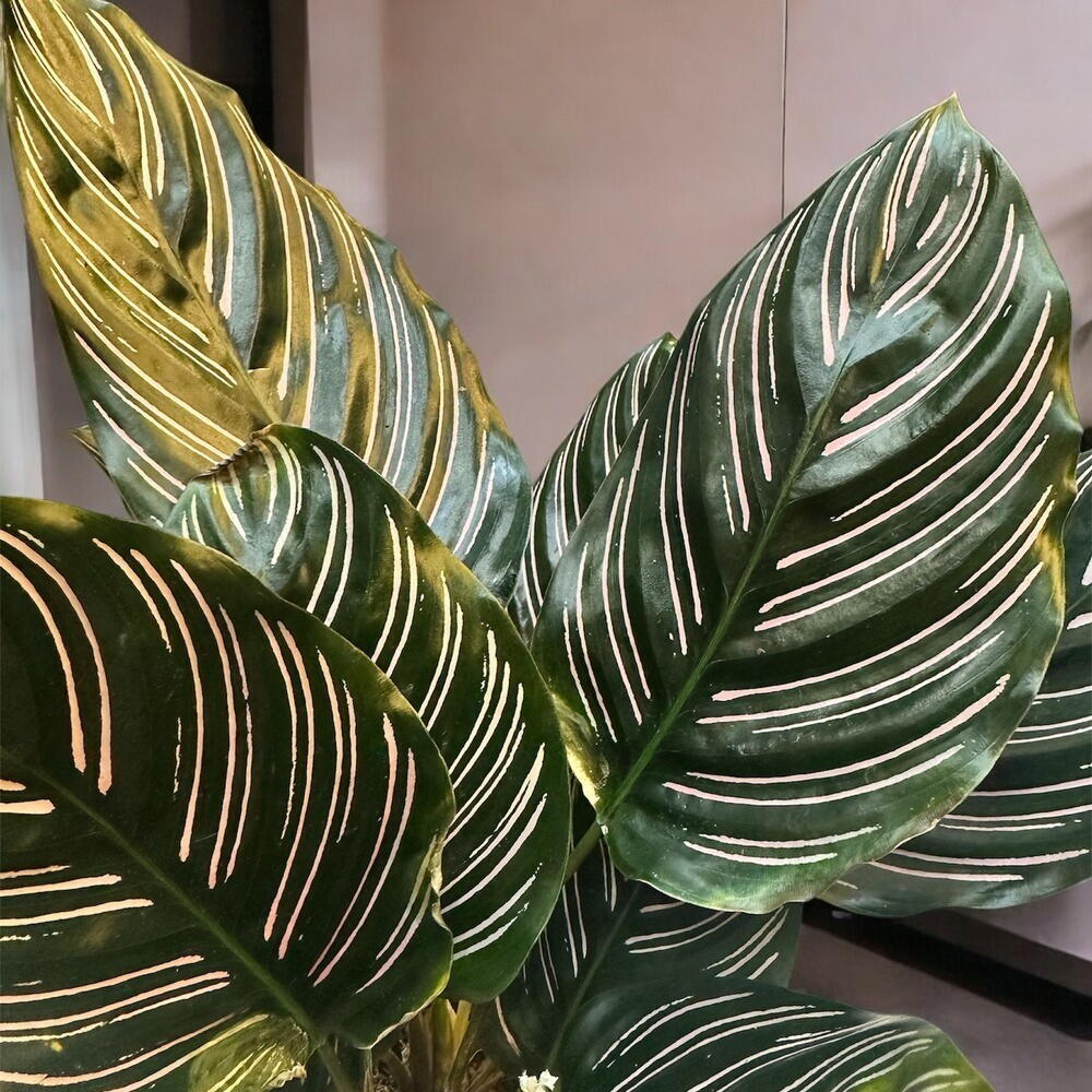 Калатея Зебрина — экзотическое растение, которое выделяется своими вытянутыми листьями глубокого зелёного цвета с серебристыми полосами, похожими на полосы зебры. Её элегантный и тропический вид делает её идеальным декоративным элементом для любого интерьера. Она прекрасно подходит для помещений со рассеянным светом и умеренной влажностью, придавая свежесть и неповторимый природный акцент. Кроме того, её способность очищать воздух делает её ещё более особенной.
