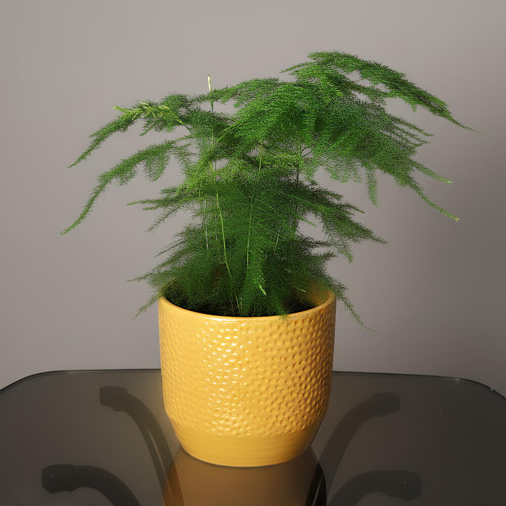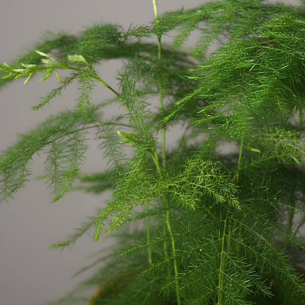 Этот прекрасный экземпляр — Asparagus setaceus, также известный как перистый папоротник или декоративная спаржа. Выделяется тонкой и эфирной листвой насыщенно-зелёного цвета, идеальной для того, чтобы придать любому интерьеру нежный и изысканный акцент.