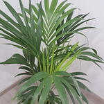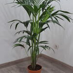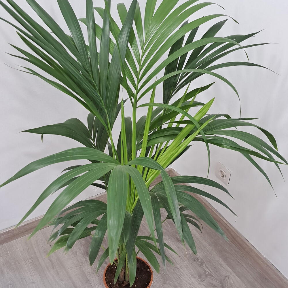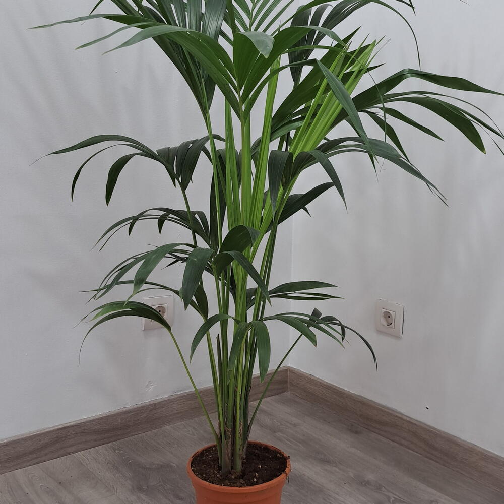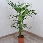 La Palmera kentia (Howea forsteriana) es una palmera ornamental muy popular para interiores gracias a su elegancia y resistencia. Altura: En interior suele alcanzar entre 1,5 y 3 metros. Hojas: Largas, arqueadas y de color verde oscuro brillante. Formadas por numerosos foliolos finos que le dan un aspecto elegante y ligero. Tronco: Delgado y único (normalmente una sola palma por maceta). De crecimiento muy lento. 🌿 Características principales Planta muy resistente y de fácil mantenimiento. Tolera poca luz, por lo que es ideal para interiores. Crecimiento lento, lo que la hace perfecta para espacios interiores durante muchos años. Tiene un aspecto tropical y decorativo, común en salones, oficinas y hoteles. ☀️ Cuidados básicos Luz: Luz indirecta o semisombra. Riego: Moderado; dejar secar ligeramente la capa superior del sustrato entre riegos. Temperatura: Ideal entre 18 y 24 °C.
