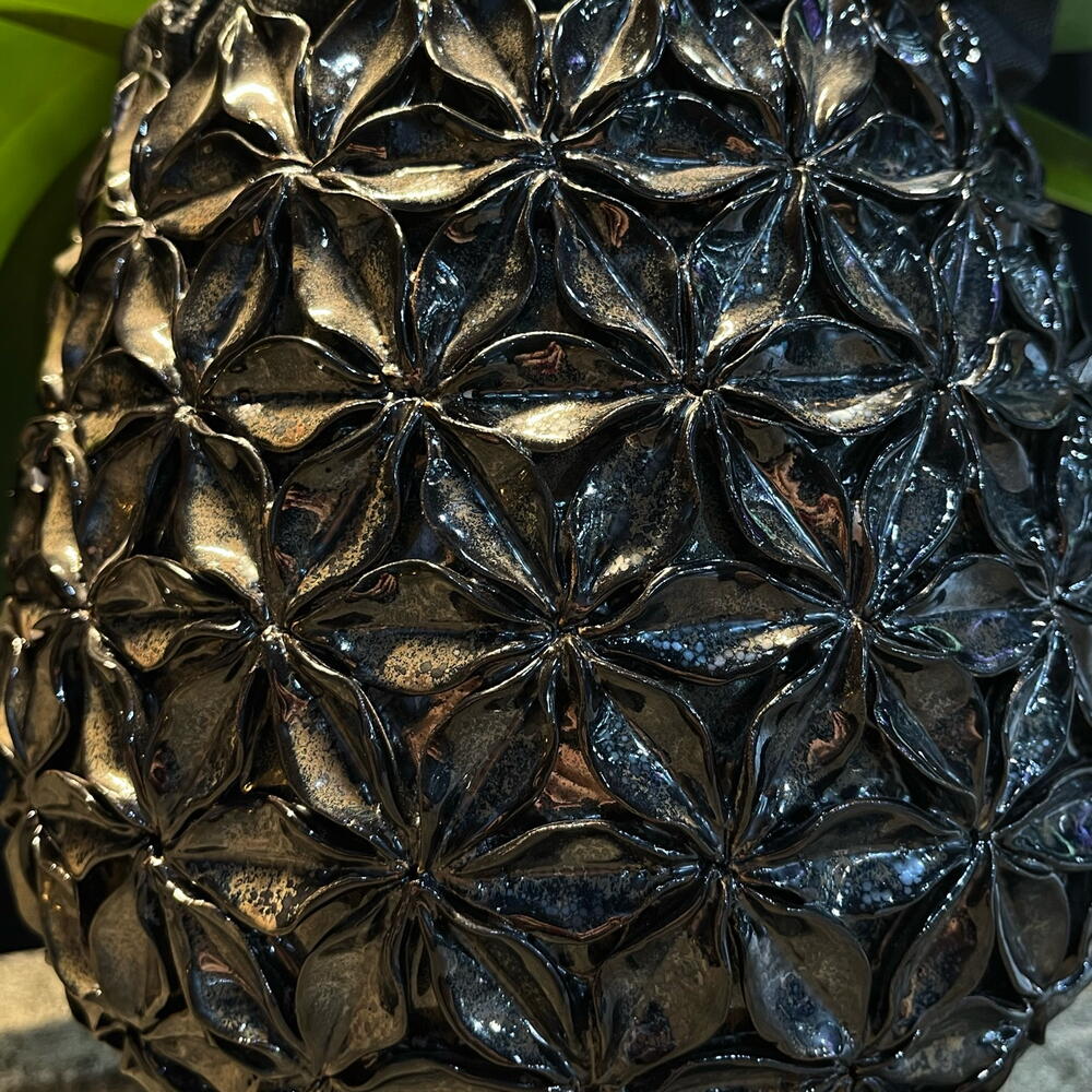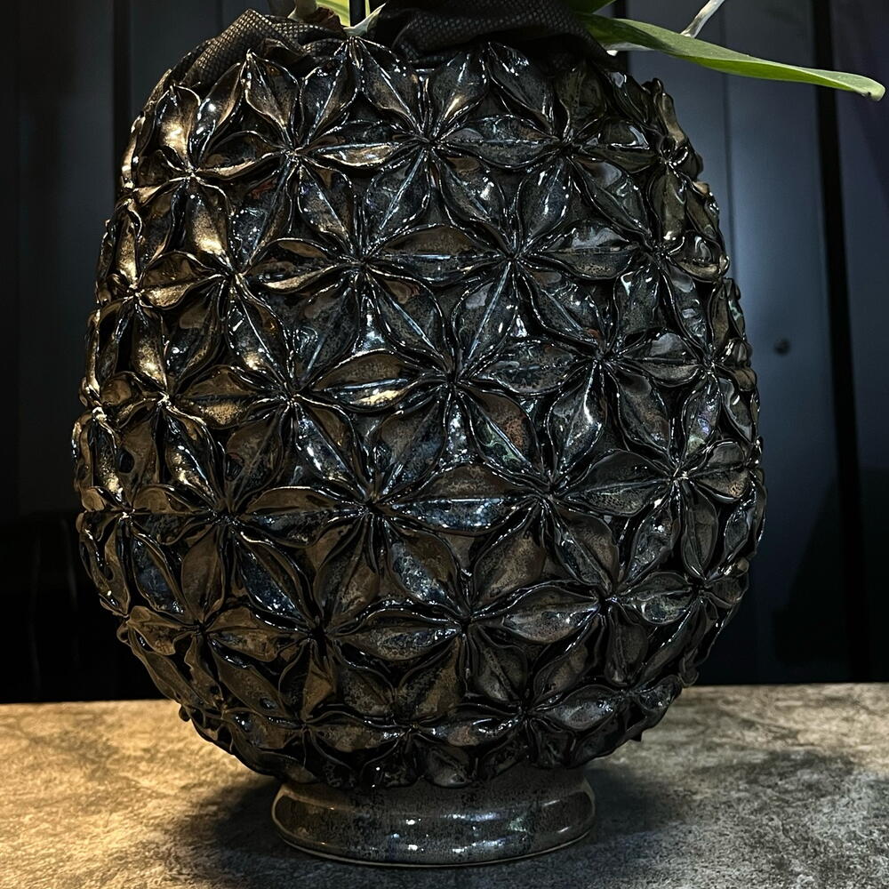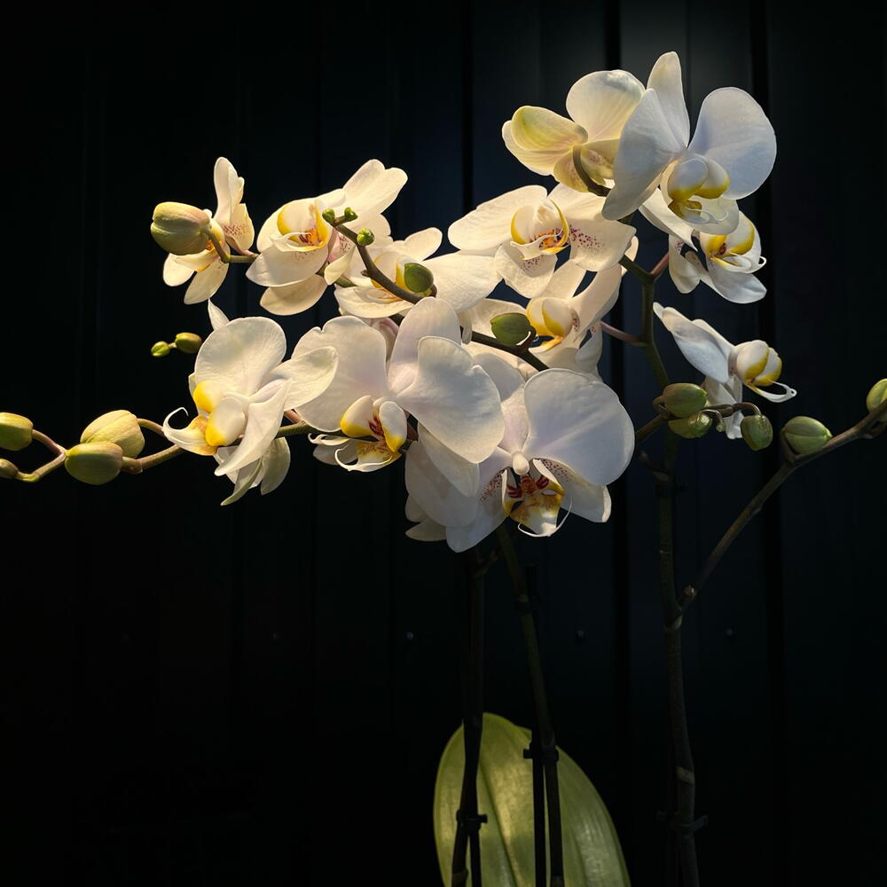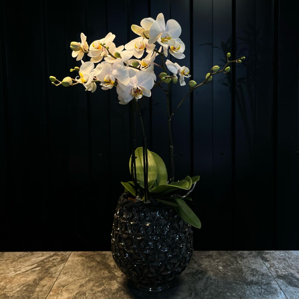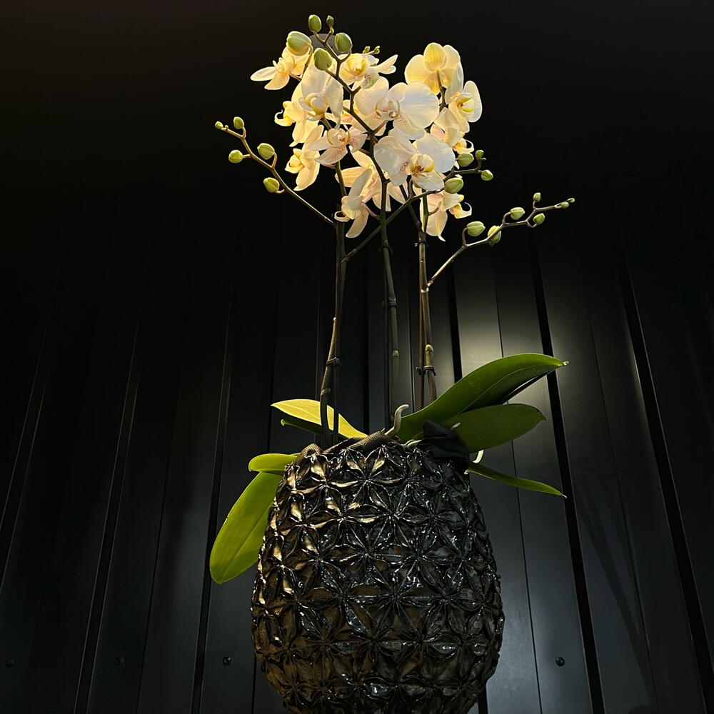Esta orquídea blanca parece un ramillete de luz flotando sobre un jarrón oscuro y elegante. Sus flores, delicadas y brillantes, se abren como pequeñas estrellas que contrastan con la profundidad del vidrio, creando una escena que mezcla calma, lujo y un poquito de magia.