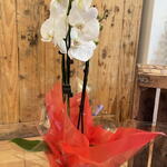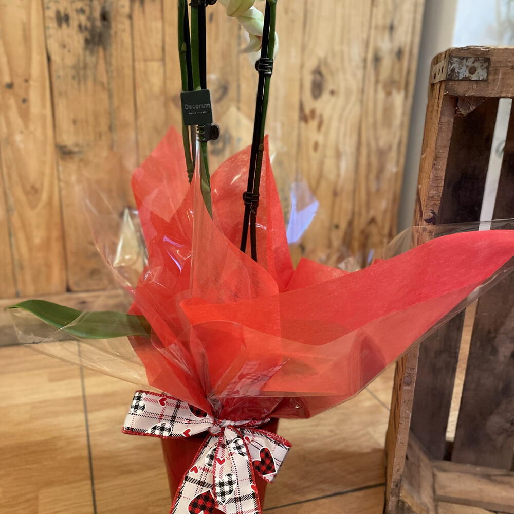 Белая орхидея Phalaenopsis в декоративном горшке, элегантное комнатное растение, идеально подходящее для украшения дома, офиса или в подарок по особым поводам. Отличается долговечными белыми цветами и простотой ухода. Растение поставляется с натуральными цветоносами, зелёными листьями и декоративным горшком с упаковкой.