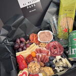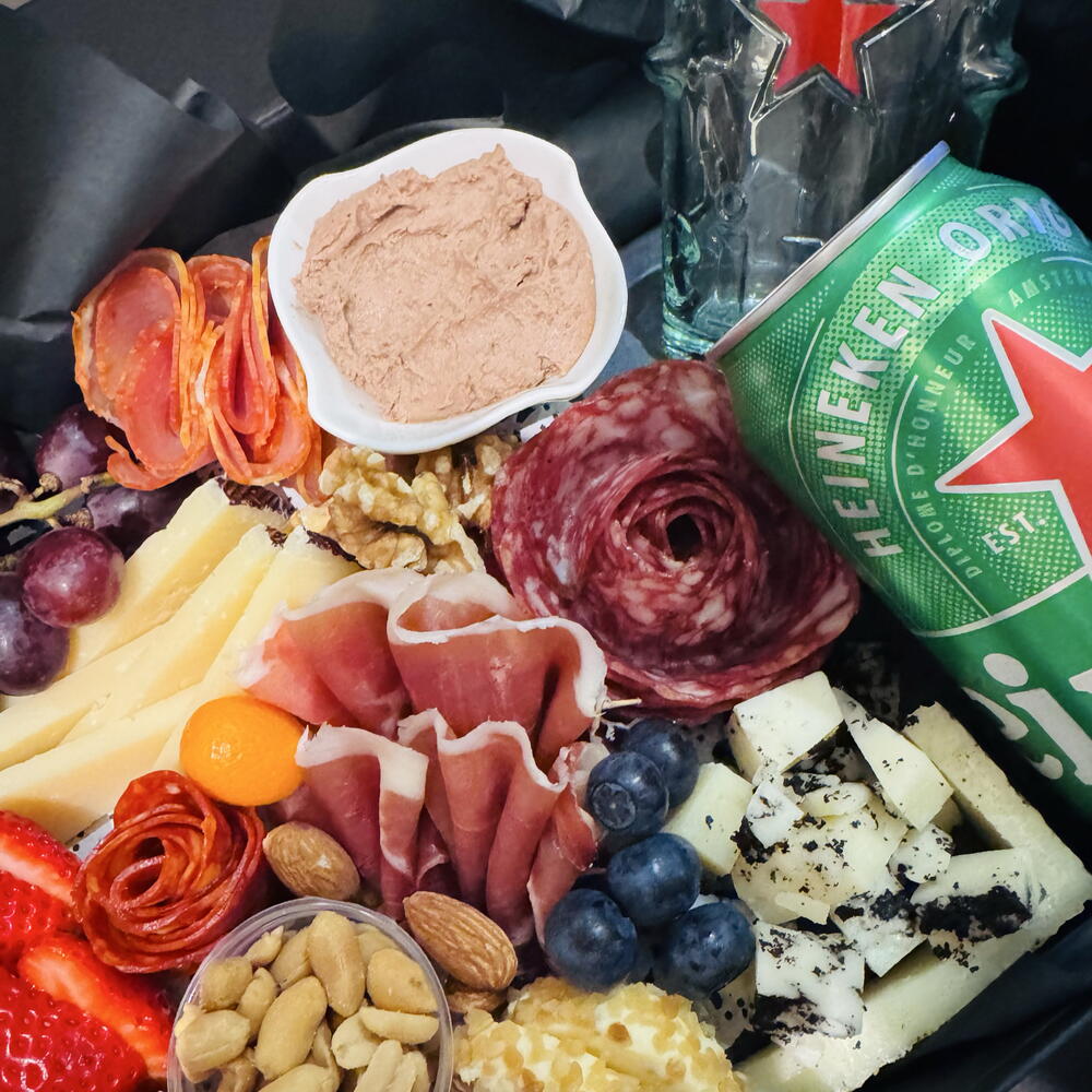 фрезас - 30 гр. шоколадные конфеты - 10 гр. орехи - 15 гр. пиво - 330 мл малина - 15 гр. выдержанный сыр - 70 гр. вяленая свиная вырезка - 30 гр. иберийское чоризо - 20 гр. черника - 15 гр. иберийский сальчичон - 30 гр. хамон серрано резерва - 30 гр. трюфельный сыр - 70 гр. свежий виноград - 50 гр. picos - 50 гр. чёрная магнитная коробка - 1 шт. стеклянная ваза - 1 шт. солёные арахисы - 15 гр. сыр с ананасом - 20 гр. набор салфеток и столовых приборов - 1 шт.