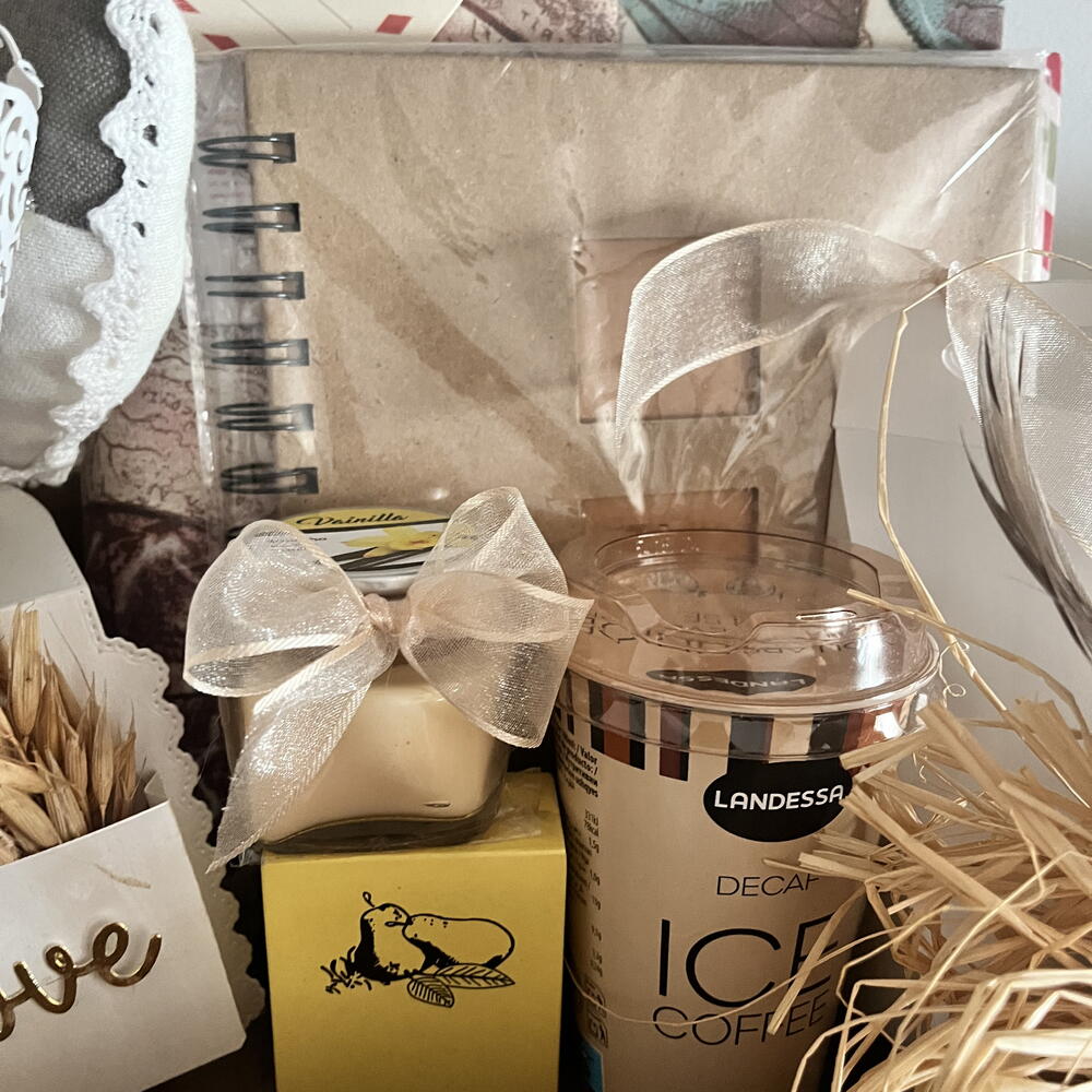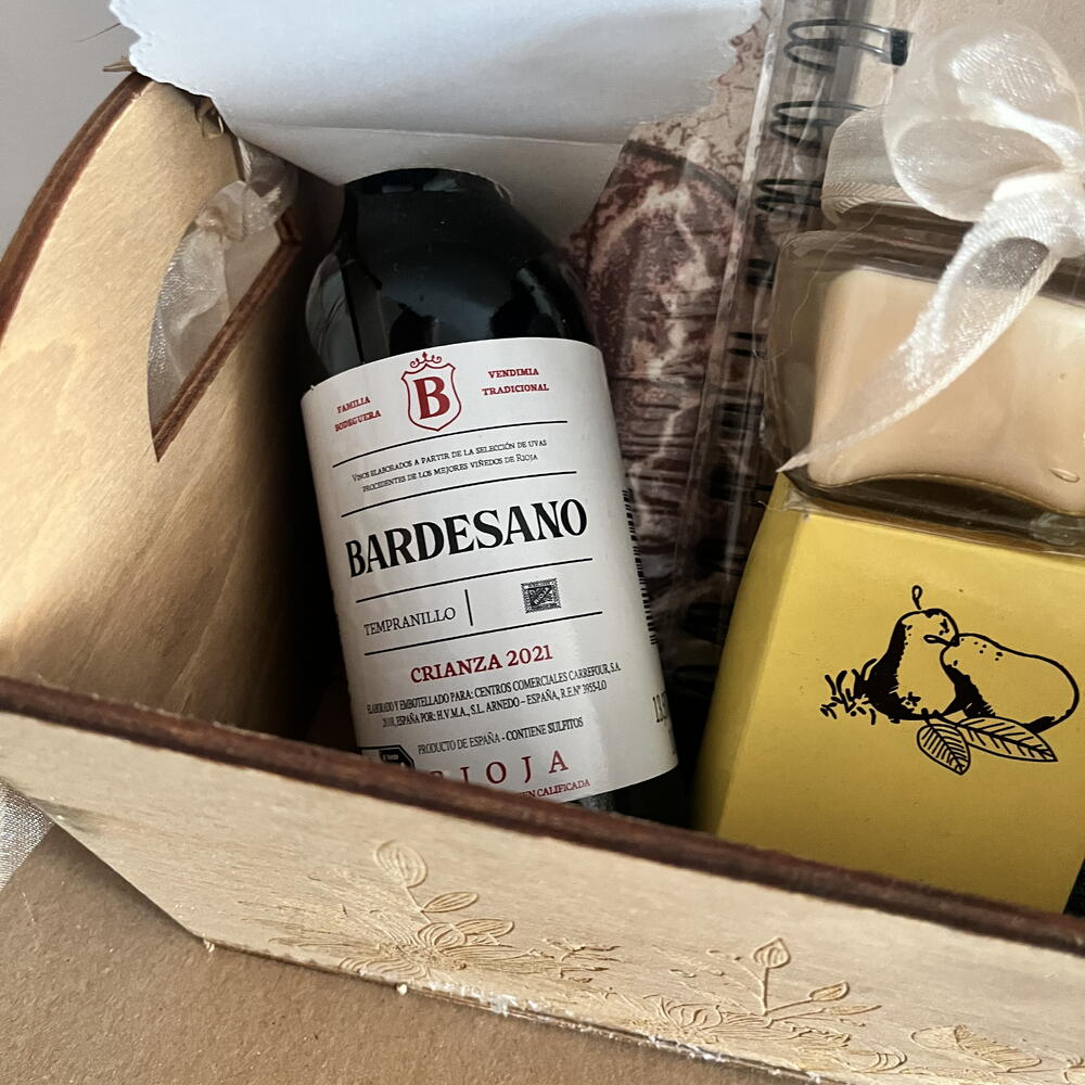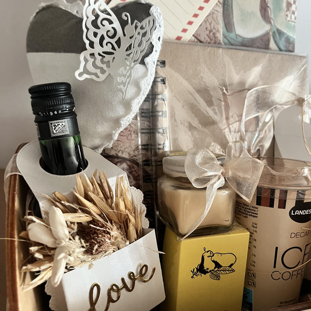 бутылка вина - 1 шт. бант из рафии - 1 шт. кофе без кофеина - 1 шт. деревянная коробка, гравированная вручную - 1 шт. птичка декор - 1 шт. коробка с печеньем с шоколадными каплями - 1 шт. блокнот для заметок - 1 шт. органайзер для счетов или важных документов - 1 шт. сердце с бабочкой декор - 1 шт. мини мыла - 1 шт.