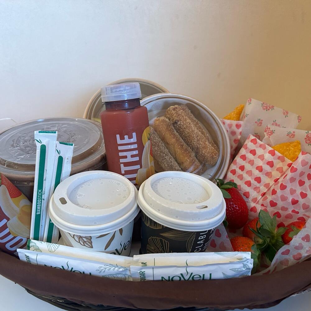 Погрузитесь в сладость корзины, полной вкусных угощений: два кофе американо для бодрости, мясные эмпанадас и сырный фриттер для утоления голода, клубнично-банановые смузи для освежения, сочная клубника для наслаждения свежестью, вкусная фасоль и спелый авокадо для полезного перекуса, и, наконец, восемь восхитительных сырных палочек — всё это в очаровательной корзинке. Если вы любите завтрак, но вам нужно заменить какой-либо продукт из-за аллергии или вкусовых предпочтений, свяжитесь с нами через чат приложения.