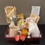 коричневая коробка - 1 шт. сезонный фрукт - 250 гр. орехи - 15 гр. керамическая чашка - 1 шт. клубничное варенье - 25 гр. скатерть - 1 шт. термос из нержавеющей стали - 350 мл бутылка натурального выжатого сока - 200 мл бутылка молока - 250 мл крафтовый поднос - 1 шт. сэндвич с ветчиной и сыром - 2 шт. содержимое коробки конфет варьируется - 5 шт. кисло-сладкие слойки с ветчиной йорк и сыром - 2 шт. салфетка и био-столовые приборы - 1 шт. чай - 1 шт. сахар и стевия - 1 шт.