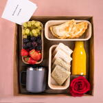 rosas rosadas - 6 шт. фрезас - 120 гр. ежевики - 80 гр. апельсиновый сок - 250 мл помидор черри - 6 шт. зелёный виноград - 150 гр. термокружка с кофе - 1 шт. свежая красная декоративная роза в коробке - 1 шт. куриные эмпанадас - 2 шт. ассорти сэндвичей - 6 шт.