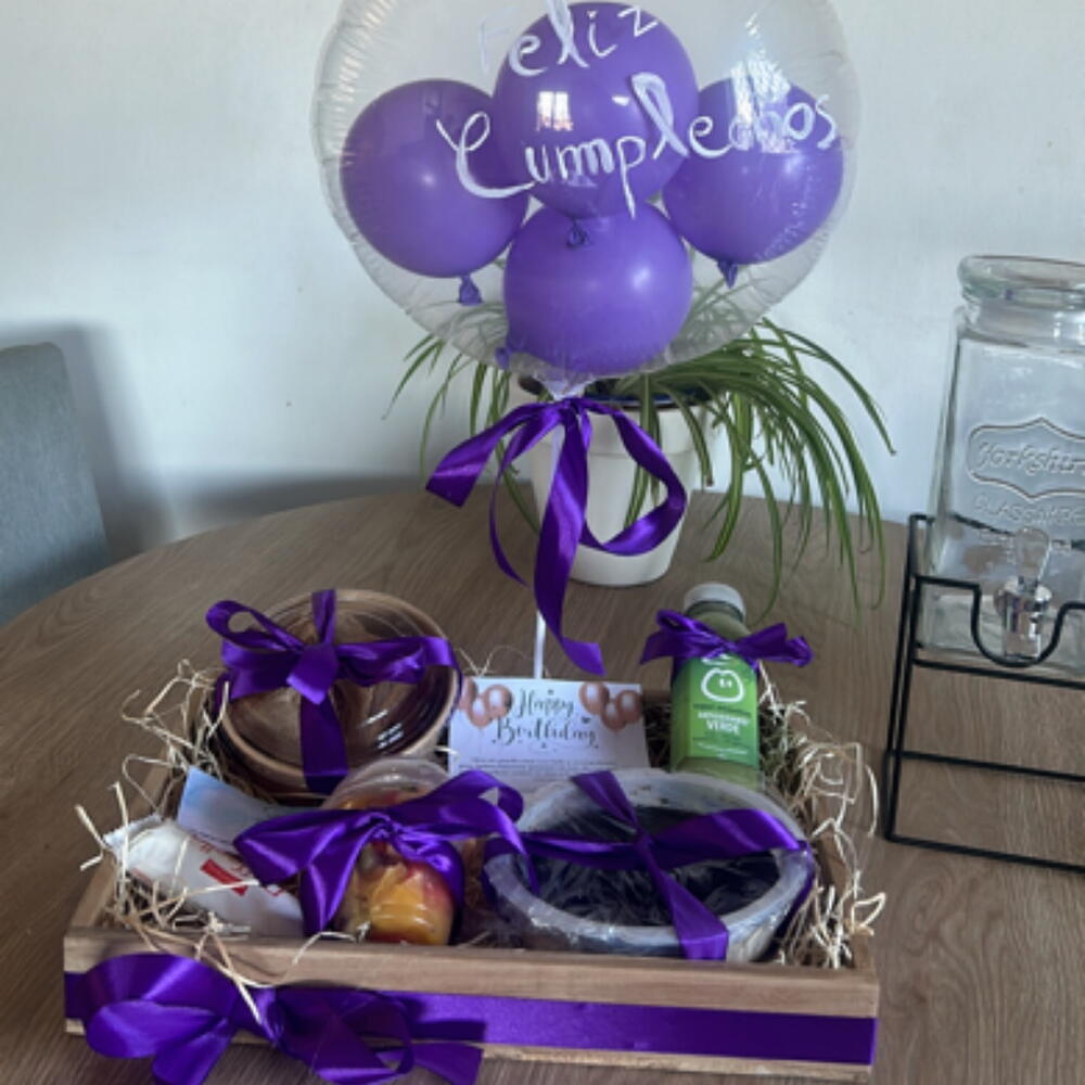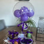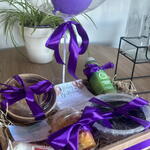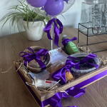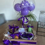воздушный шар - 1 шт. фруктовый салат - 1 шт. мини пастель - 1 шт. персонализированная открытка с посвящением - 1 шт. дополнительный поднос - 1 шт. сэндвич с ветчиной и сыром - 1 шт. шоколадные конфеты Раффаэлло - 3 шт. молочный коктейль - 1 шт.