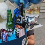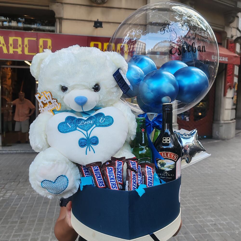 Snickers - 8 шт. декоративная коробка - 1 шт. персонализированный шар-бабл - 1 шт. плюшевый медведь - 1 шт. декоративный бант - 1 шт. бейлис - 1 шт. шар в форме звезды - 1 шт.