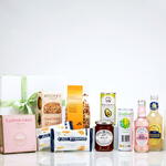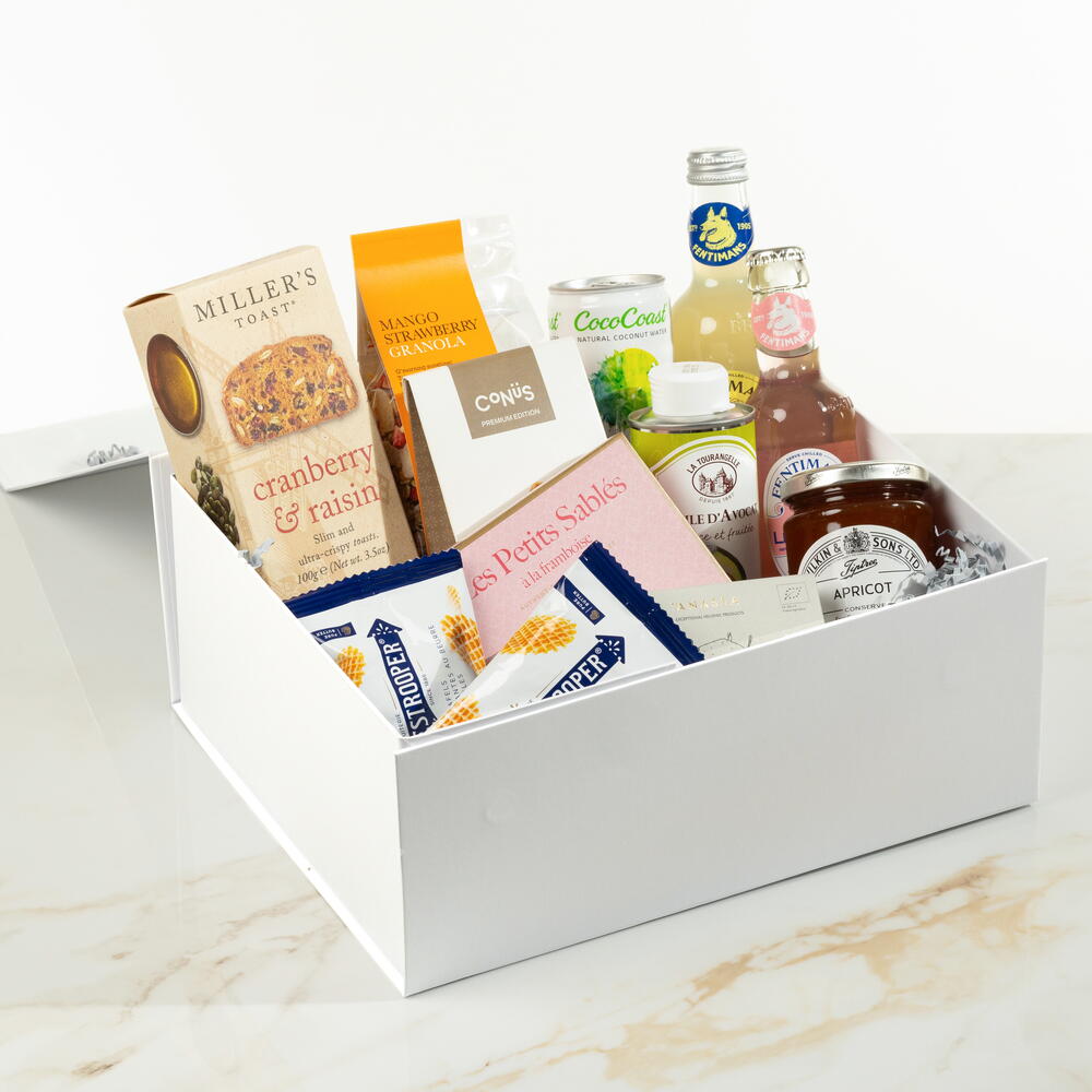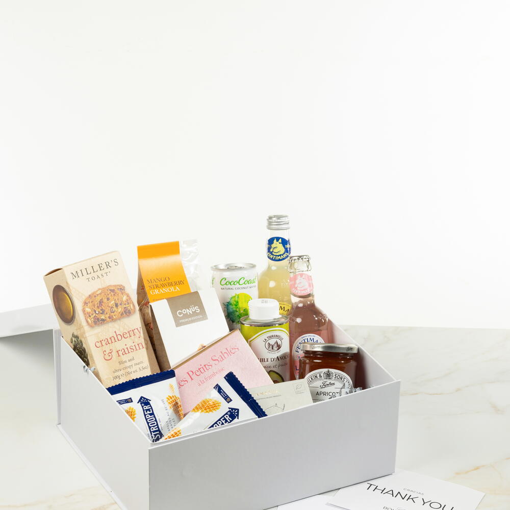 rose lemonade - 1 шт. лимонад - 1 шт. конус из молочного шоколада и пралине - 1 шт. jules destrooper сливочные вафли - 2 шт. гранола манго - 1 шт. масло авокадо - 1 шт. абрикосовый джем - 1 шт. millers тост с клюквой - 1 шт. кокосовая вода - 1 шт. маленькие песочные печенья - 1 шт. органическая ромашка - 1 шт. белая подарочная коробка с лентой - 1 шт.