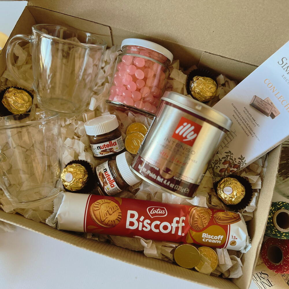 мини нутелла - 2 шт. конфеты ferrero rocher - 4 шт. жестяная банка молотого кофе illy 125 г - 1 шт. чашки миски - 2 шт. плитка шоколада simón coll - 1 шт. пакет печенья biscoff - 1 шт. банка, наполненная хлопьями, покрытыми шоколадом - 1 шт.