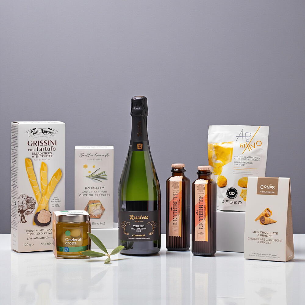 Тщательно подобранная коллекция, передающая суть средиземноморского наслаждения. Набор Mediterranean Delight Gourmet Box объединяет лучшие продукты ручной работы, достигая идеального баланса вкуса, элегантности и изысканности. Включает: * Recaredo Terrers Brut Nature 2019 – изысканное испанское игристое вино, изготовленное из органического винограда и выдержанное до совершенства. * Tartuflanghe Truffle Grissini – хрустящие итальянские хлебные палочки с неповторимым ароматом трюфеля. * The Fine Cheese Co. Rosemary and Olive Oil Crackers – нежные и ароматные, с аутентичным средиземноморским колоритом. * Caviaroli Drops – инновационные жемчужины из оливкового масла, которые добавят изысканности любому блюду. * Le Tribute Tonics (2 шт.) – премиальные миксеры ручной работы с элегантным и освежающим растительным профилем. * Печенье Desire Saladi Biscotti с пармезаном – итальянские пикантные крекеры из выдержанного сыра пармезан и оливкового масла первого отжима. * Конусы из молочного шоколада и пралине – хрустящие бисквитные конусы, наполненные нежным пралине и покрытые молочным шоколадом. Оформление: Тщательно упаковано в черную подарочную коробку, украшенную атласной зеленой лентой, готовую порадовать даже самых взыскательных гурманов. Подарочные наборы стали одним из самых популярных вариантов подарков в Барселоне. Сочетая премиальные продукты с элегантным оформлением, эти тщательно подобранные коллекции предлагают роскошный и запоминающийся способ отметить особые события. Подходит для многих праздников: Дни рождения Годовщины Новоселья Корпоративные подарки Праздничные торжества