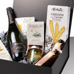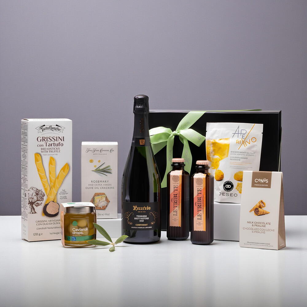 чёрная коробка с лентой - 1 шт. гриссини с трюфелем tartuflanghe - 1 шт. крекеры с розмарином и оливковым маслом the fine cheese co - 1 шт. caviaroli капли - 1 шт. солёные бискотти deseo с пармиджано реджано - 1 шт. тоники le tribute грейпфрут - 2 шт. конус из молочного шоколада и пралине - 1 шт. кава рекаредо брют натюр 2020 - 1 шт.