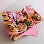сэндвичи, завернутые розовой лентой - 2 шт. шоколадки, покрытые розовым воздушным рисом - 2 шт. декорированные соломинки - 1 шт. бутылка какао - 2 шт. бутылка апельсинового сока - 2 шт. печенье в форме сердца - 4 шт. боул с гранолой, клубникой и киви - 2 шт.