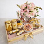 Ferrero - 6 шт. апельсиновый сок - 1 шт. вафли - 3 шт. чиабатта с салатом - 1 шт. парфе с гранолой - 1 шт. бокалы для кавы - 2 шт. кава мини - 1 шт. разные цветы (фото может отличаться) - 1 шт. кофе с молоком - 1 шт.